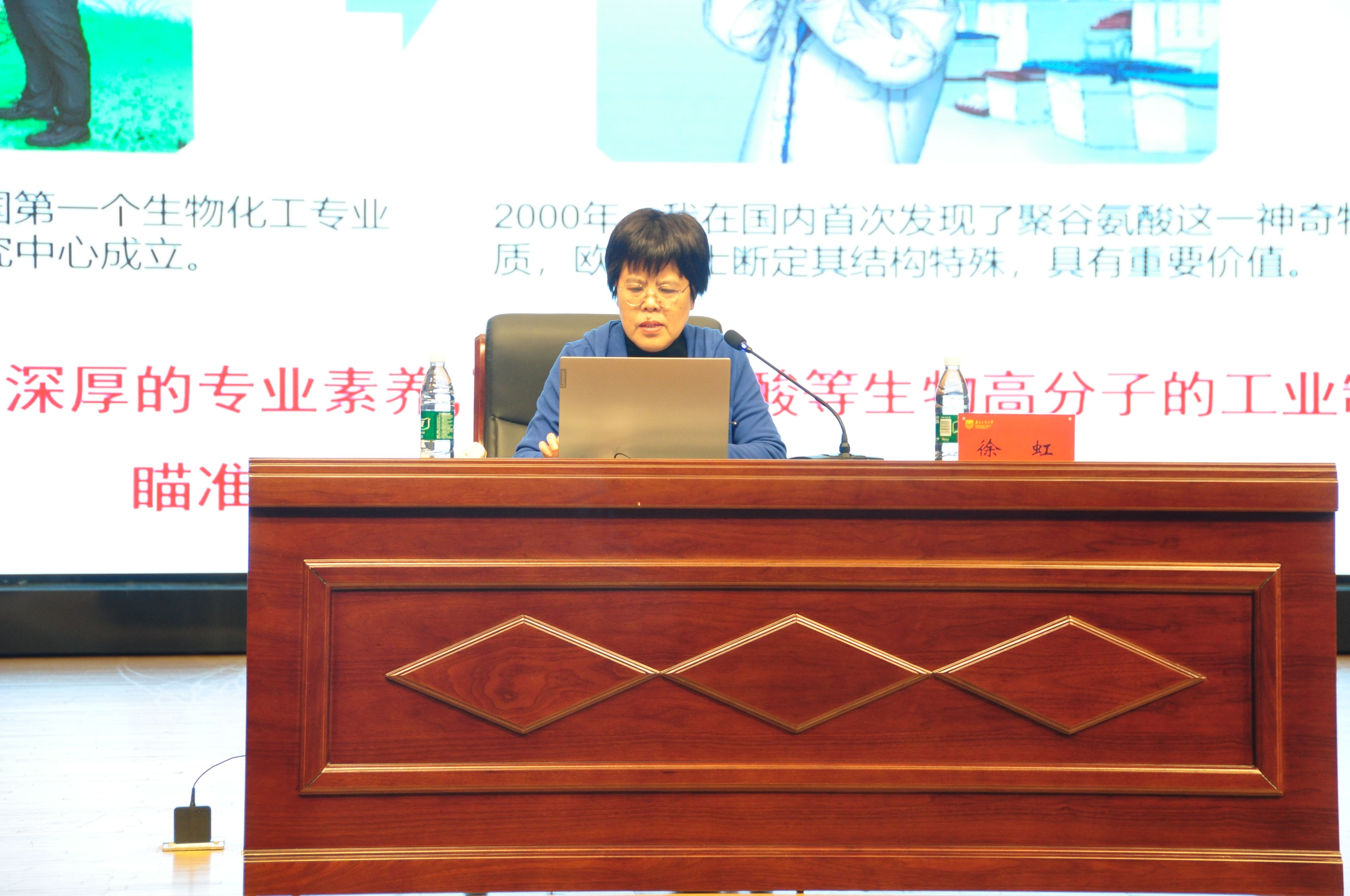 报告会上,徐虹教授结合自身的科研经历,分享了她在科研路上的奋斗历程,她说:“遇到一个好老师是人生的幸运”,她的人生导师欧阳平凯院士,一生“忠诚精实”,用人生经历书写科研报国篇章。而在董事长、院士、科协主席、全国党代会代表等众多称谓中,让欧阳平凯院士最引以为傲的也是“教师”这一称谓,那些创新创业的优秀员工,欧阳平凯院士如数家珍,他始终强调:“科技创新一定要以问题为导向,不能跟在别人后面跑”。徐虹教授谨记欧阳平凯院士的教诲,在2004年获得国内第一个聚谷氨酸生物合成技术授权专利,2005年发表国内首篇γ-PGA生物制备的SCI论文 ,开启了国内微生物制备聚谷氨酸研究的先河,并在全球率先应用于农业领域研究。