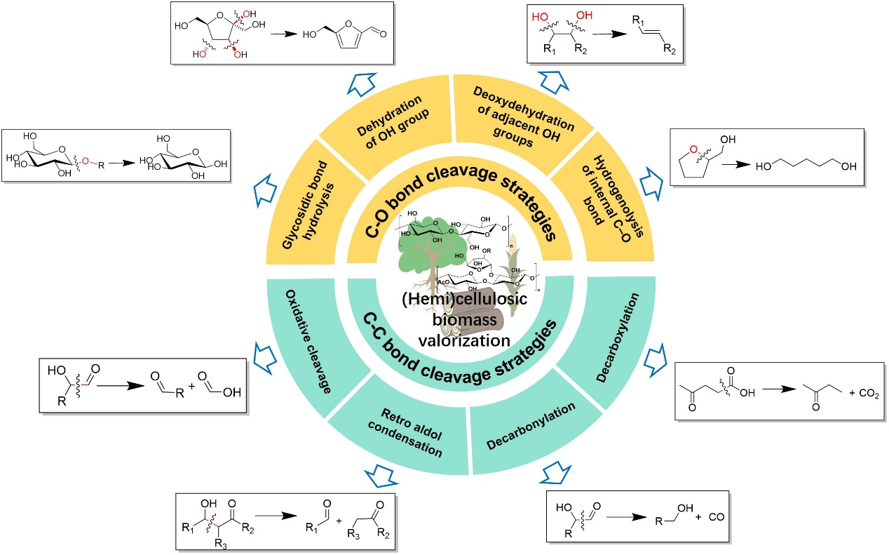 纤维素基生物质作为来源广泛、廉价易得的可再生有机碳资源,具有替代化石资源生产低碳绿色化学品、燃料、材料的巨大潜力。然而,生物质的高氧含量、复杂含氧基团、以及相对稳定C–C键是面临的主要挑战,通过C-O和C–C键的选择性断裂对纤维素基生物质升值利用至关重要。