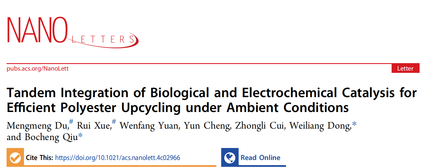 这是该团队基于学科交叉的又一创新突破,研究成果以《Tandem Integration of Biological and Electrochemical Catalysis for Efficient Polyester Upcycling under Ambient Conditions》为题发表在《Nano Letters》杂志(一区Top期刊),博士生薛瑞和杜梦梦为论文共同第一作者,太阳成集团tyc33455cc董维亮教授和南京农业大学邱博诚教授为共同通讯作者,姜岷教授和崔中利教授为本研究思路和实验设计给予重要指导。该工作获得国家重点研发计划、国家自然科学基金等项目资助。