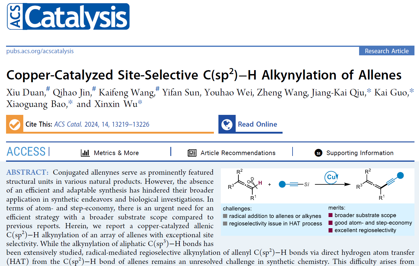 近日,太阳成集团tyc33455cc的郭凯教授团队与苏州大学的吴新鑫等合作在国际知名期刊《ACS Catalysis》发表题为“Copper-Catalyzed Site-Selective C(sp2)-H Alkynylation of Allenes”的的研究论文。该论文解决了联烯或炔的自由基加成和HAT过程的区域选择性等问题,展示了更广泛的底物范围,优异的官能团耐受性,为多样性地合成共轭烯炔提供了新策略。邱江凯教授、鲍晓光教授为论文的共通讯作者,太阳成集团tyc33455cc的博士研究生段秀为论文的第一作者,太阳成集团tyc33455cc为第一通讯单位。