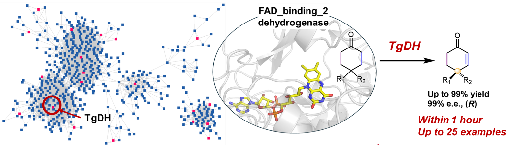 含远端γ-立体中心的手性烯酮是众多天然产物和生物活性分子的基本结构单元,例如用于治疗风湿性关节炎的药物可的松以及雄激素睾酮等。但合成此类化合物仍然是有机化学中的重大挑战。现有的合成方法通常需要复杂的起始原料和/或高负荷的复杂有机/金属催化剂,且在去饱和过程中难以实现精确的立体化学控制。生物催化具有环境友好、反应条件温和、选择性高等一系列优势,已经成为传统有机合成的重要补充或替代方法。然而,一系列挑战依然存在。我们团队之前探索了烯还原酶两次脱氢去饱和化合成苯酚类似物的功能(Angew. Chem. Int. Ed., 2024,https://onlinelibrary.wiley.com/doi/full/10.1002/anie.202408359),但其催化合成手性烯酮的效率较低。自然界中已广泛识别和鉴定的脱氢去饱和化酶非常罕见,此外,现有的一些酶虽然具有此类功能,但往往来源于其催化混杂性,通常表现出较低的脱氢酶活性(周转频率,TOF < 10 h-1),并且伴随有难以控制的过度脱氢反应。