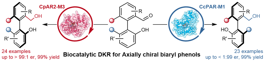 公司郭凯/胡玉静课题组成功开发了一种新型生物催化方法,可用于高效合成一系列对映体互补的轴手性联芳基酚。该策略基于工程化醇脱氢酶催化高立体选择性动力学拆分还原反应,并借助室温下可快速消旋的半缩醛中间体维持外消旋底物的动态平衡,进而实现了高效的酶促动态动力学拆分。经过定向进化改造的两种工程醇脱氢酶表现出优异催化活性与立体选择性,能够以超过99%的转化率获得对映选择性比值高达99:1的R/S构型的目标产物。该研究不仅为轴向手性化合物的对映体互补合成提供了绿色、高效的合成新路线,也拓展了醇脱氢酶在动态动力学拆分还原反应中的应用范围。