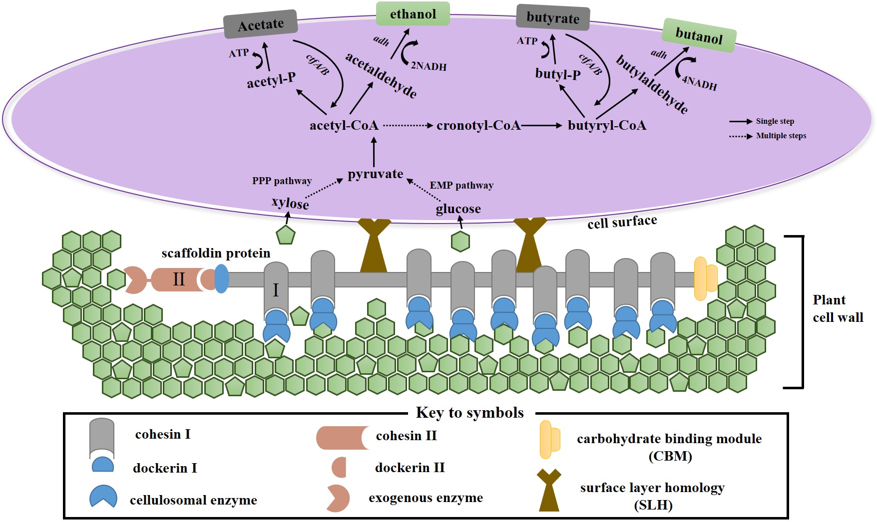 利用合成生物学技术手段,改造纤维梭菌可实现从木质纤维素直接合成丁醇,然而丁醇的浓度和生产强度仍远低于淀粉质原料为底物。文章从菌株改造、混菌体系构建和纤维小体融合技术等多个角度系统阐述了通过CBP利用木质纤维素合成生物丁醇的现状,并提出构建嗜热菌株的混菌发酵体系和提高木质纤维素的水解速率是提升CBP过程中生物丁醇合成效率的关键。构建嗜热和嗜温的混菌体系,可实现纤维素降解和丁醇合成功能的分区,减少单菌的代谢负荷,提升木质纤维素合成生物丁醇的效率。通过纤维小体融合改造技术解除水解底物抑制和提升木质纤维素水解速率,是提高木质纤维素直接合成生物丁醇效率的另一关键因素。