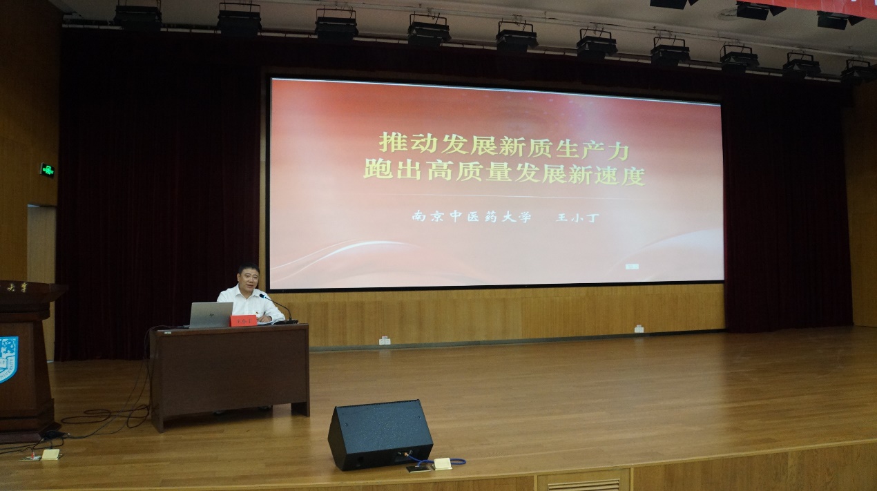 庆祝活动结束后,公司还特邀南京中医药大学马克思主义公司·医学人文公司党委副书记、副经理王小丁教授为大家带来了题为《推动发展新质生产力,跑出高质量发展新速度》的专题党课,王教授从新质生产力的内涵谈起,结合江苏因地制宜发展新质生产力的生动实践,以及生物与医药产业发展现状和科学家精神深入浅出的为大家阐述了如何在生物医药领域培育和发展新质生产力。