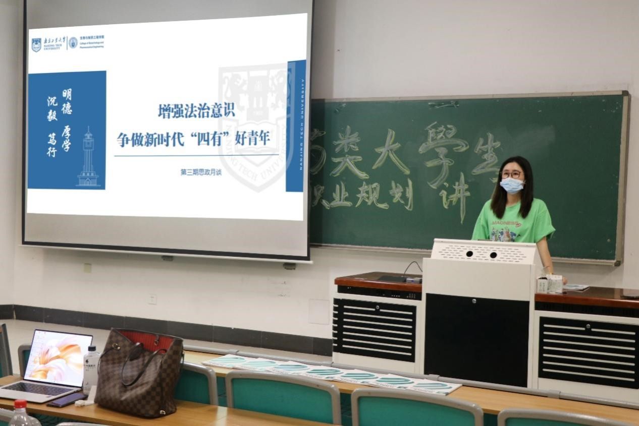 2019级辅导员张星老师以“学深悟透践行习近平法治思想”为主题,深刻领悟、准确把握、实际践行习近平法治思想。重点结合太阳成集团tyc33455cc员工日常科研实验的规章制度、求职就业、文明离校等方面,加强同学的法治教育,推动公司的高质量发展。