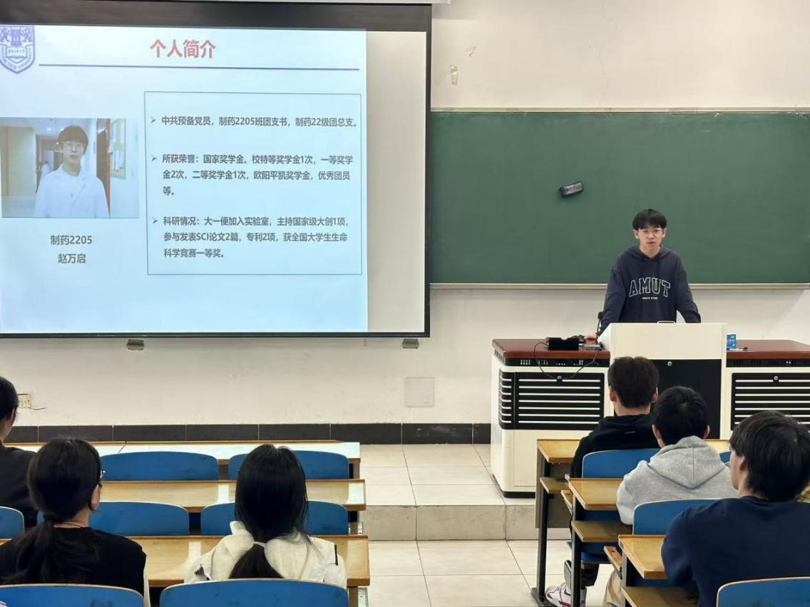本次讲堂邀请了三位优秀的学长作了经验分享。获得全国老员工生命科学竞赛一等奖的赵万启学长细致地讲述了在大学中如何找到属于自己的方向。他强调“念念不忘,必有回响”,要勇于尝试和不懈坚持,鼓励同学们在学好专业课的同时,合理分配自己的时间,积极参与各类竞赛,多向老师和学长请教,拓展自己的视野和能力,提升自己的专业能力。制药 2103 的孙中政学长分享了宝贵的学习经验。他从制定学习计划、高效利用时间等方面入手,为同学们提供了切实可行的学习方法。制药 2102 的苗轩瑞学长分享了自己的学习经验和面试经历。他以生动的事例,让同学们了解到实践中的挑战与收获。