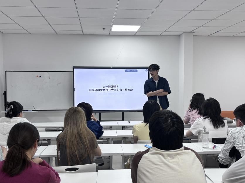 周宏宇同学以自身经历为主线,分享了如何从“科研小白”成长为能够独立开展研究的本科生。他强调了兴趣的重要性,建议同学们通过参加学术会议、关注前沿研究成果以及利用微信公众号等资源拓宽视野。在谈到科研与学习的平衡时,他提出了“四象限法则”,帮助同学们高效管理时间,并举例说明如何在保证学业成绩的同时投入科研。此外,他还详细介绍了自己参与的iGEM竞赛经历,包括团队分工、实验设计以及国际交流的收获,鼓励同学们勇于尝试学科交叉研究,提升综合能力。
