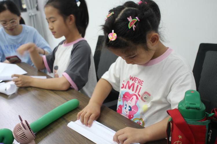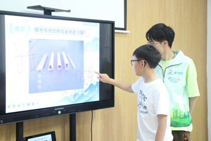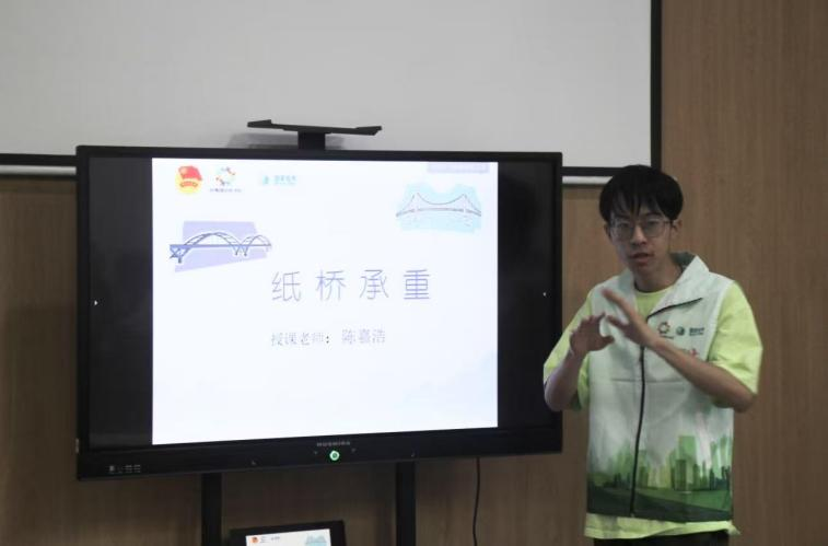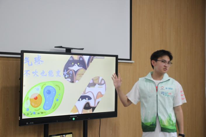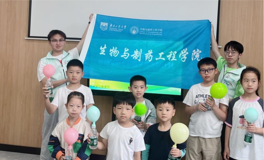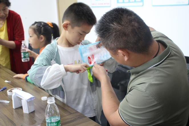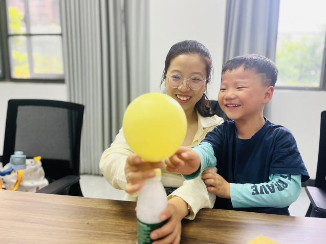 “原来薄薄的纸也能变成大力士!”一位小朋友兴奋地展示自己的作品。首场实验课中,生工2302班陈嘉浩同学以“纸桥承重”为主题,带领孩子们用普通A4纸搭建桥梁模型。“如何用最轻的纸承载最重的砝码?”他通过问题引导孩子们思考力学结构设计,讲解并展示了折叠、拼接等技巧。孩子们积极动手,折出不同的桥梁形状,反复测试不同桥型的承重能力。第二堂课中,生工2304班张玉廷同学将复杂的“细胞呼吸”知识转化为趣味实验。他指导孩子们在塑料瓶内倒入白醋,向气球中装入小苏打,当气球套上瓶口后,两种物质反应产生二氧化碳气体,瞬间将气球“吹”得鼓鼓的。“这就是细胞呼吸产生能量的过程!”张玉廷用生动比喻解释生物原理。孩子们看着逐渐膨胀的气球,眼神都亮了起来。此刻,科学的种子已然播撒在他们心中。