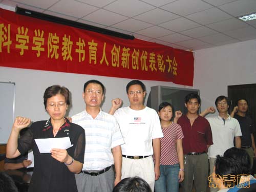 党员教授何冰芳博士率领新教师面向鲜红的国旗庄严宣誓:忠诚人民的教育事业,履行教师的神圣职责;教书育人,为人师表;关爱员工,教学相长;追求真理,崇尚科学;终身学习,创新创优;为高等教育事业的发展,贡献出全部智慧和力量!