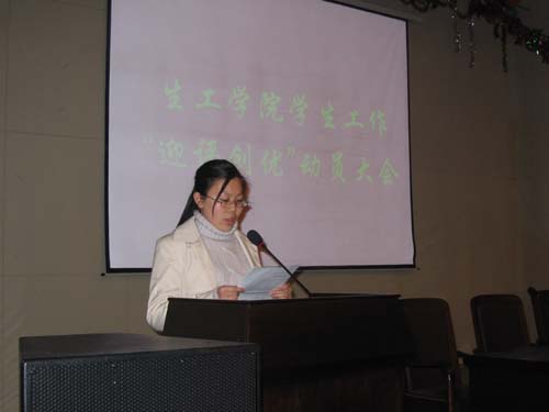 公司员工工作办公室主任郑万秋老师根据公司员工工作“迎评创优”动员大会的精神,对全院员工“迎评创优”工作提出了实施意见。生工0202班刘欣同学代表全院同学从6个方面表达了“迎评创优”的誓言。