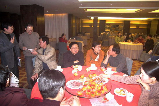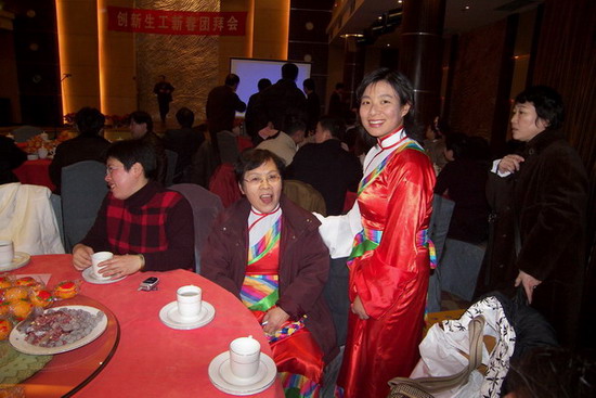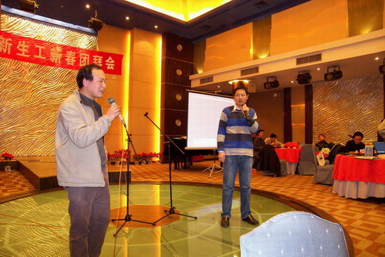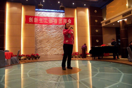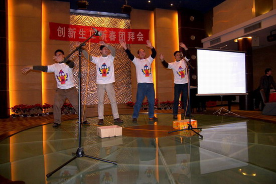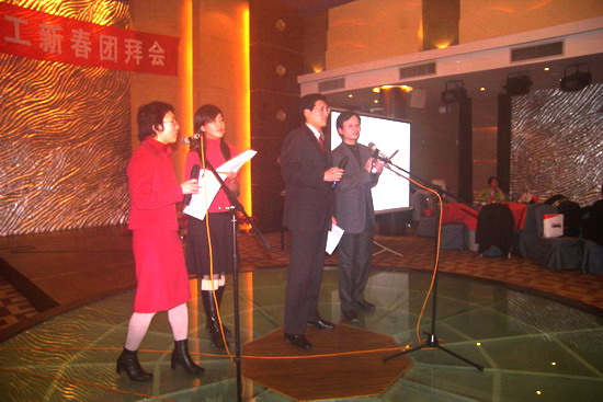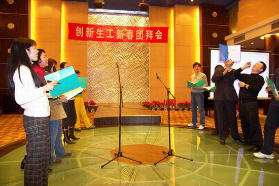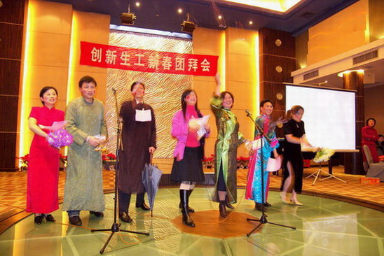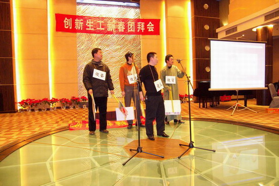 团拜会上,由公司教职员工演出的综艺节目颇有创意,喜闻乐见。大家载歌载舞,分享2005年公司团结拼搏丰收后的欢乐,用激情和微笑憧憬未来,对2006年公司在“迎评创优”、团队建设、自主创新等方面再建新功,充满了美好的祝福。