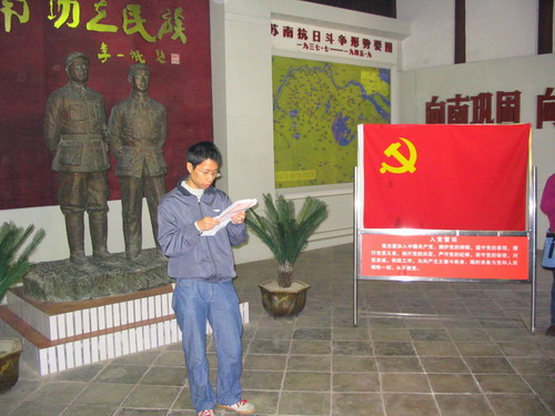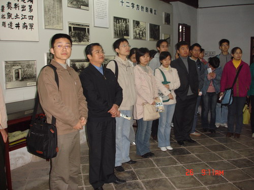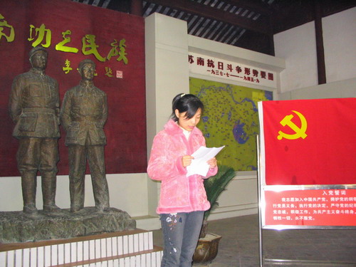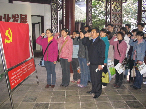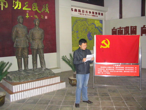 途中,大家通过车载音像设备观看革命战争影片《大决战》,对“我们党成为执政党,是历史的选择、人民的选择”感受尤为深刻。抵达目的地后,研究生党员们怀着对革命先烈的崇敬之情,瞻仰陈毅、粟裕同志的铜像,在鲜红的党旗下举行了庄严的宣誓仪式。3名党员联系思想实际分别交流了心得体会,表达了“缅怀先烈、以史励志、永葆先进”的决心。缪昌美老师代表公司党委讲话,从牢记入党誓言,增强党性修养,升华理想责任,提高贯彻“三个代表”重要思想的自觉性,身体力行 “创业、创新、创优”精神,永葆共产党员的先进性等方面,对研究生党员们提出了殷切的希望。大家反映,此次活动内涵丰富,引人深思,令人感奋,进一步激发了我们的历史使命感和时代责任感。昔日,革命先烈用血与火的巨笔在党旗上书写下了“时代先锋”四个大字,今天,我们要用奉献和创造为党旗增光添彩,为中华民族的伟大复兴作出我们应有的贡献。
