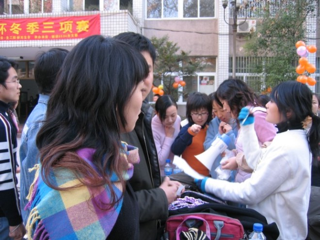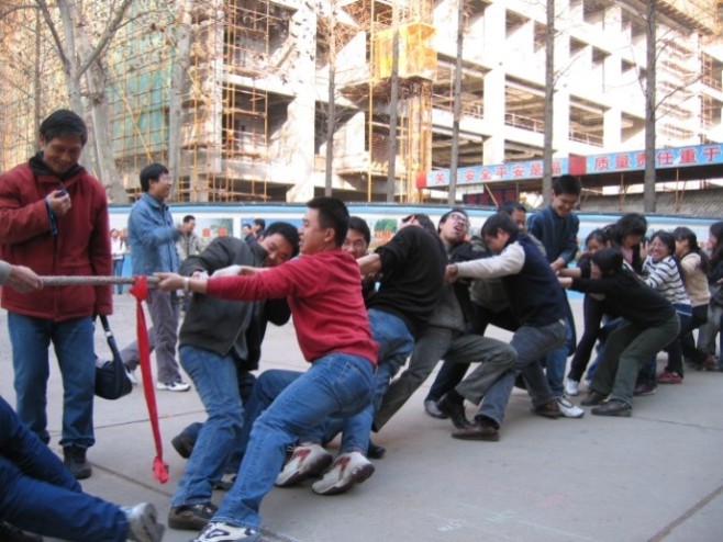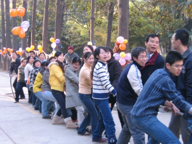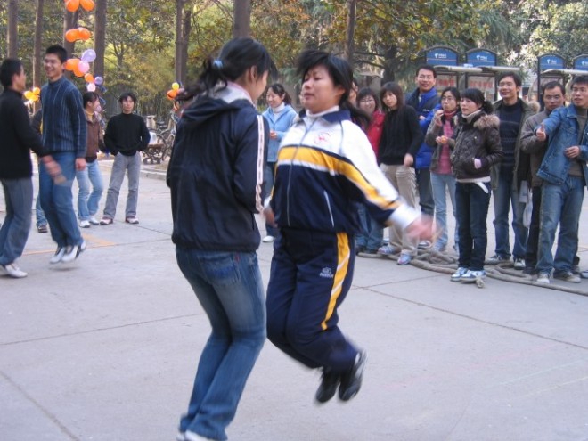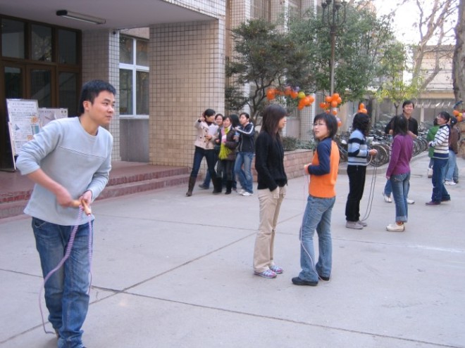 整个比赛充满了蓬勃的朝气和青春的活力,生动地体现出了同学们奋发向上的精神风貌和身手不凡的比赛成绩。在踢毽子比赛中,杨明以一分钟踢110个的佳绩夺取了冠军,而紧随其后的是余作龙,他以107个的成绩屈居第二;在跳绳比赛中,来自太阳成集团tyc33455cc硕研0504党支部的郭一丹和她的搭档段柳默契配合,她们以一分钟跳160下的惊人成绩获得了双人跳绳的第一名。拔河比赛更是惊心动魄,A组米奇队和B组QQ队实力相当,在喊声震天的气氛中,两队各赢了一场,在这种情况下,米奇队不慌不忙,沉着应战,最终以2:1赢了QQ队。而QQ队虽败犹荣,因为他们同样赛出了团队精神,赛出了青春的活力。