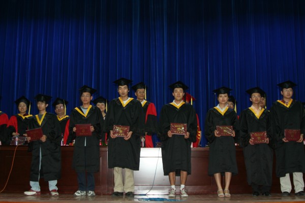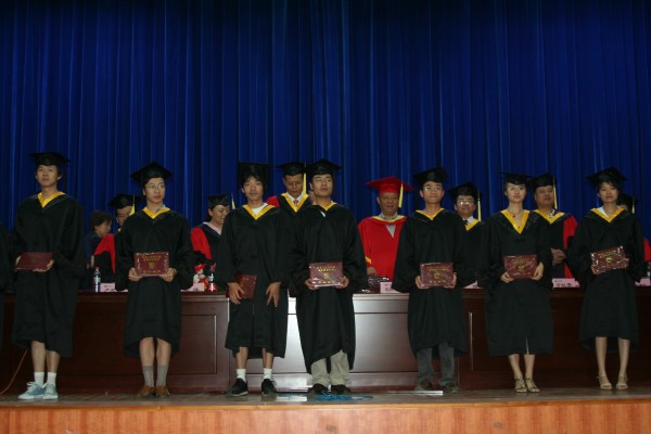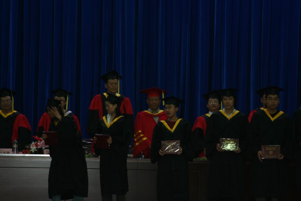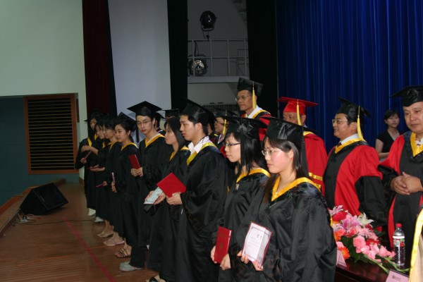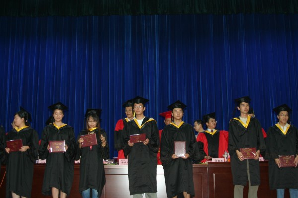 卢定强副经理宣读了关于2006届毕业生成绩合格、准予毕业的决定。280名毕业生在欢快的乐曲声中依次走上主席台,从导师手中接过深红的毕业证书并合影留念,感受顺利完成学业后的喜悦。