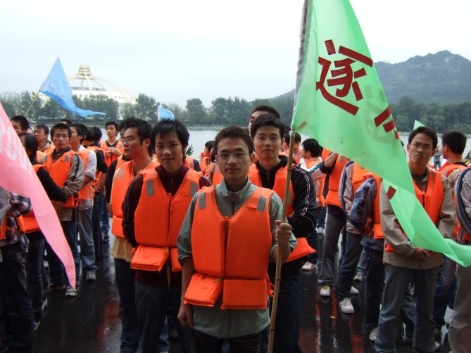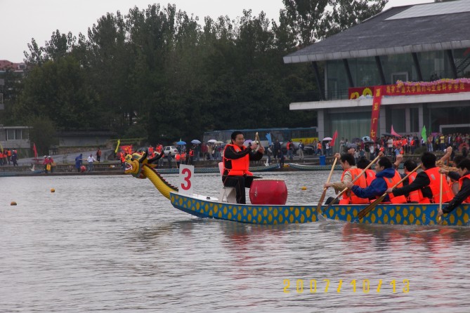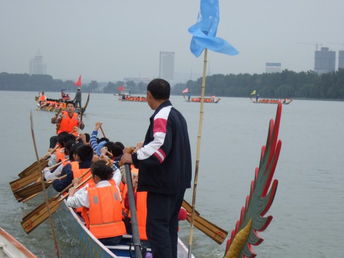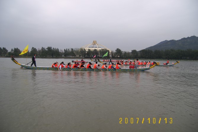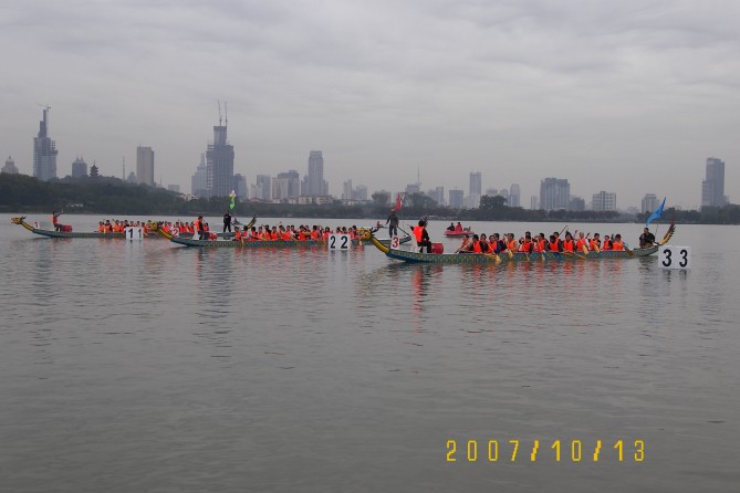 虽然清晨秋雨阵阵,但并没有浇灭大家的参赛热情,反而激发了大家的斗志,感动得天公抖擞精神,把雨也停了。师生们组成的10只队伍在玄武湖上劈波斩浪、挥桨竞渡,演绎了一场群龙争斗、精彩纷呈的龙舟盛会。观众们自发组成拉拉队,为龙舟队员加油助威。一时间划桨声、锣鼓声、呐喊声、欢呼声使得玄武湖上欢声雷动,热闹非凡。