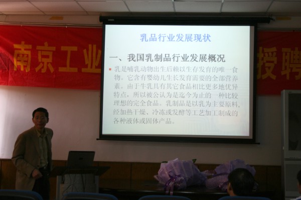 受聘仪式结束后,杨金宝教授、姜金斗教授分别作了“我国乳品行业现状及发展前景”报告和“乳品检验技术专题报告”。学术报告会由教务处副处长、食品科学与工程系主任熊晓辉教授主持。食品科学与工程系的部分师生、南京同凯兆业生物技术有限责任公司的专业技术人员共80余人参加了学术报告会。