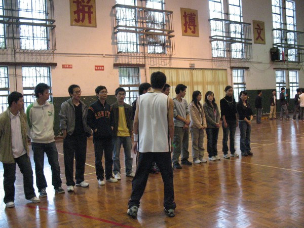 拓展训练在同学们的掌声和欢呼声中拉开帷幕。百名参训同学被分成若干个组,每组人数相当,称为一个团队。每一个团队,自行选出一名队长、一名副队长,并设计出自己的队名、队标、队歌和口号。经过无领导小组现场酝酿,形成了P King、黄巾队,火之队、狼队、小强队、十七狼等六支团队。然后以团队为单位,进行团队融冰、齐眉棍、车轮滚滚、信任背摔、驿站传书等活动。齐眉棍活动中,团队成员用手指托住一根细棍,将其放到地上,途中每个人的手都不能离开细棍,速度最快者胜出;车轮滚滚活动中,每队用报纸做成一个圈,大家排成一列站在圈里,一边用手在头顶传送报纸,一边一起前进;信任背摔活动中,由八名保护队员双手交叉成托盘,接住向后倒下的同学;驿站传书的活动中,同学们要遵守一定的规则,将信息传递。一个个精彩纷呈的活动,一次次将现场气氛推向高潮。