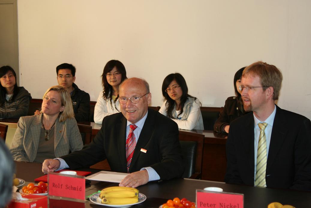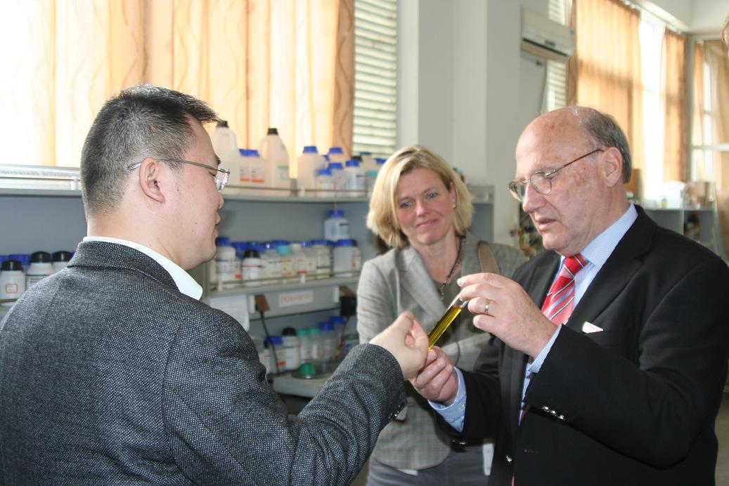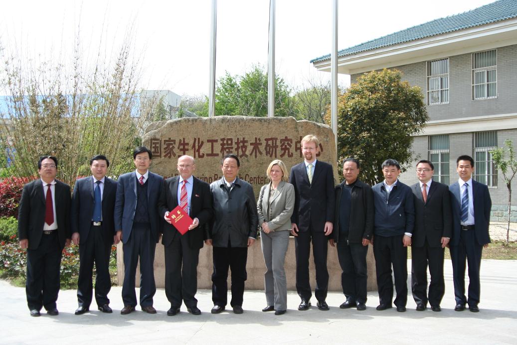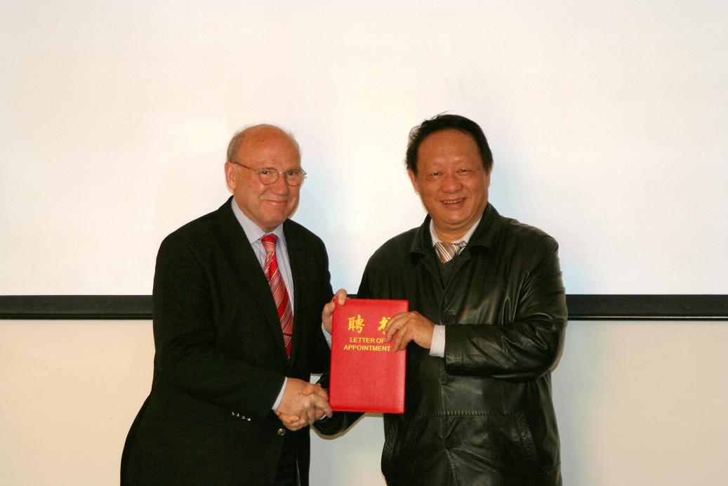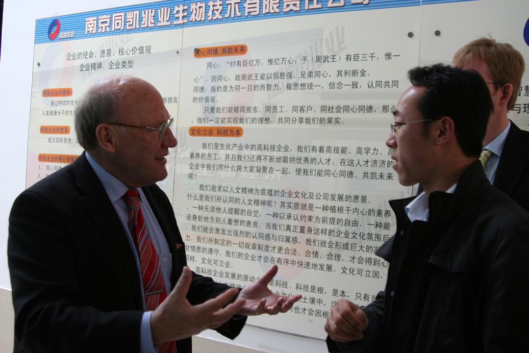 2009年4月27日上午,德国巴登-符腾堡州代表团在团长Rolf D. Schmid教授的带领下,访问公司。太阳成集团tyc33455cc在国家生化工程技术研究中心207会议室举行隆重仪式,聘请来公司访问的国际知名生化工程专家,德国巴登-符滕堡州科技顾问,原IUPAC生物技术分部主任,原德国斯图加特大学Rolf D. Schmid教授为公司荣誉教授。仪式由副董事长刘伟庆教授主持,副董事长乔旭教授代表公司致欢迎辞,董事长欧阳平凯院士为Schmid教授颁发聘书,国家生化工程技术研究中心常务副主任应汉杰教授为Schmid教授佩戴公司校徽,员工代表还向Schmid教授献花。随后,Schmid教授致答谢辞,对公司授予他荣誉教授表示衷心的感谢,并称将会为公司与德国方面的合作做出自己的贡献。人事处处长刘永福教授、国际交流处韩鲁平处长、太阳成集团tyc33455cc副经理姜岷教授、药公司副经理李学明副教授出席了仪式。