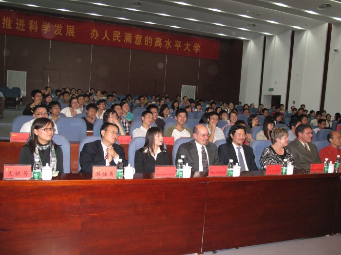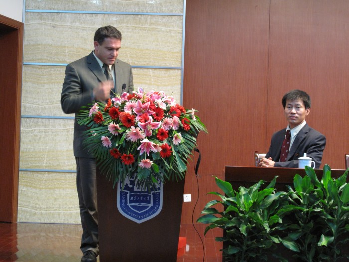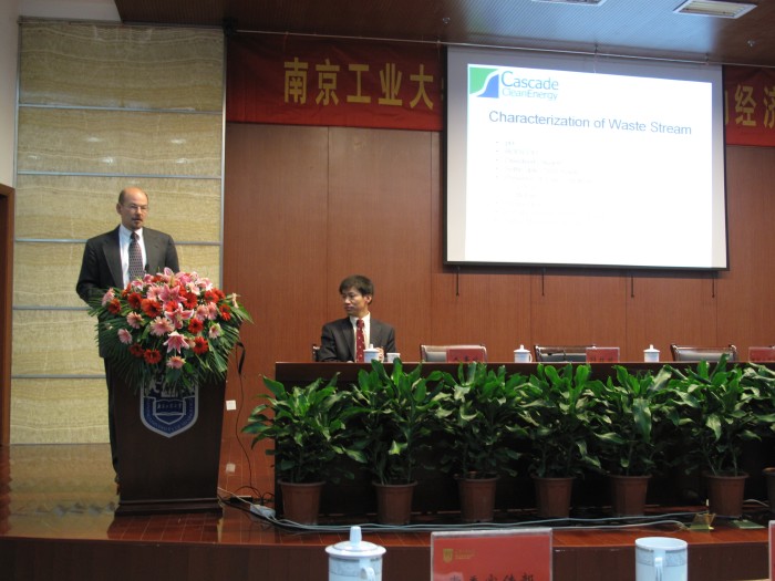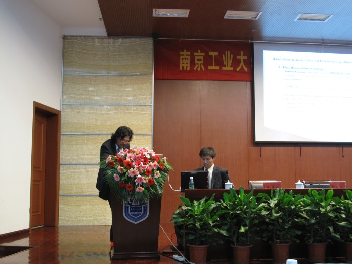 代表团肖恩•基尔戈罗先生是一位美国工程院认证的职业工程师,专门从事可再生能源项目的发展。他作为美国加德绿色能源有限公司的共同创始人之一,目前担任该公司的副总裁。 肖恩配合周楚新博士把一项高深的计算机辅助微生物种群选择技术,用到污水处理工艺。肖恩先生给广大师生介绍了美国污水处理的概况,提出美国污水排放标准是“健康标准”,而不是传统意义单纯使用”COD,BOD”等指标衡量。为了全民的健康,中国在污水处理标准方面有很多可创新之处。