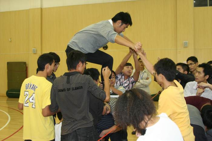 翻越火线 此时,每个队员不再有自己的小团队,大家都属于一个集体。所有的队员都可以通过自荐的方式,由大家推选出四名队长,最终余洋等四名队员当选为这个大团队的队长,带领大家翻越火线。规则是在翻越过程中不允许任何一名队员触到绳子,否则所有的队员重新开始,并且四名队长将要受到惩罚。在前两次翻越中,我们都失败了。第三次我们再也不允许失败,在队长的带领和教练的指导下我们成功翻越了,此时场面沸腾极了,大家都激动地鼓掌着、拥抱着。之后,教练肯定了大家这种顽强的作风和指出了这个环节遇到的问题。由于我们的队员在翻越过程中需要踩在用身体作为支架的队员背上,然而很多队员在这个过程中没有脱下鞋子,并且有下蹲的姿势,致使在结束后我们看到他们后背都留下红红的印迹。此时,我们每一个人都感动了,有些队员流下了感动的眼泪,在场的所有女生都齐声喊道“生工的男生都是纯爷们”,大家都向前与他们拥抱、击掌。是的,在生活当中我们需要感恩。感恩的心,不分你我。正如教练所说的那样,我们会感谢父母,感谢老师,那么我们都还能否记得那些曾经给我们帮助过的人呢。一个人如果连感恩都不懂,那么不管他现在站在什么位子上都不会走很远的。