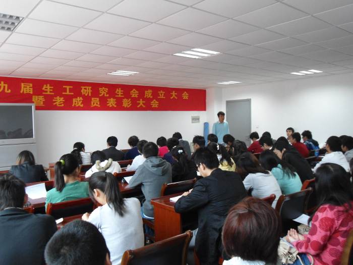 第八届生工研会主席夏海东慷慨激昂地为大家总结了过去一年的工作,并对新的一届研究生会提出了建设性的意见,他希望大家再接再厉,勇于超越,不随波逐流,这样才能更好地放飞青春的梦想。第九届生工研会主席牛潇代表所有成员表态,一定会竭尽所能不负厚望,切实增强研会自我教育、自我提高的能力,努力提高社会责任感和使命感,不断扩大生工研会文化的影响力。研会各执委为大家介绍了各自分管的工作及相应部门的主要职责。最后,研会新成员一一走上前台作了简单的自我介绍。