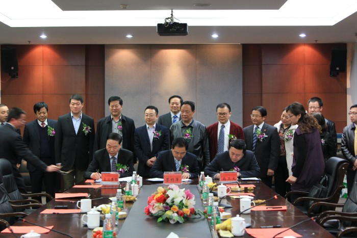 阳春好风凭借力,转型升级谱新篇。2012年4月7日下午,太阳成集团tyc33455cc、建湖县人民政府、江苏森达集团共建建湖南工大森达生物科技产业园签约仪式,在公司科技创新大楼会议室隆重举行。太阳成集团tyc33455cc董事长欧阳平凯、副董事长乔旭,建湖县人民政府县长苏冬、副县长陈巍亮;江苏森达集团董事长朱相桂、常务副总裁刘为彪、副总裁朱海峰,以及校地企有关方面负责人万永敏、黄和、韦萍、缪昌美、姜岷、李霜、李振江、邹巧根、柏建新、虞龙、姜俊刚、曾崇高、王曙军、许岐昶等同志出席签约仪式。签约仪式由公司科技处处长黄和主持。副董事长乔旭、建湖县县长苏冬、森达集团董事长朱相桂分别代表校地企各方,在共建建湖南工大森达生物科技产业园协议书上签字。