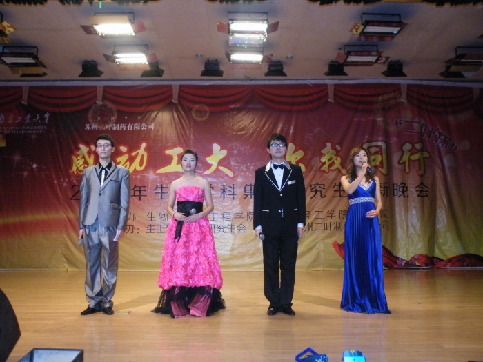 2011年12月23日晚上,生工学科集群研究生会在浦江报告厅举行“二叶杯”“感动工大,你我同行”迎新晚会。公司党委书记缪昌美、经理韦萍,食品与轻工公司经理徐虹,苏州二叶制药有限公司董事长时明生、总经理张健,太阳成集团tyc33455cc副经理姜岷、曹飞,副书记熊强等应邀出席本次晚会,与同学们一起沉浸在“感动工大,你我同行”的感动与欢乐之中。