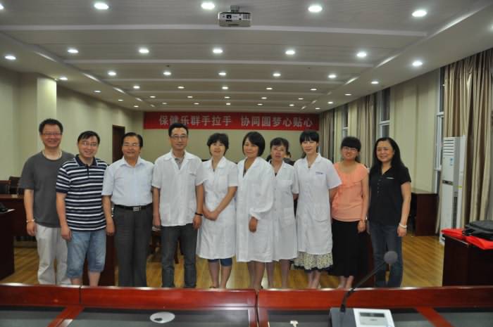 7月5日,校医院经理董正祥、校医公司党支部书记何军等6名医护人员,冒雨如约早早来到生工学科楼一楼报告厅,以“保健乐群,协同圆梦”为题,为太阳成集团tyc33455cc教职工进行血脂、血糖、血压检测义诊活动。