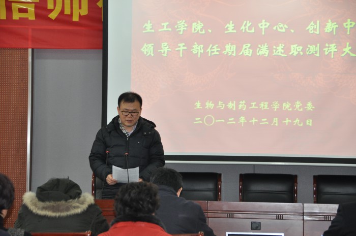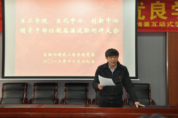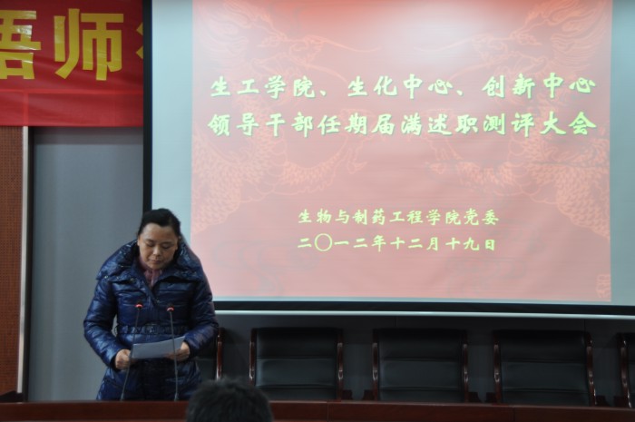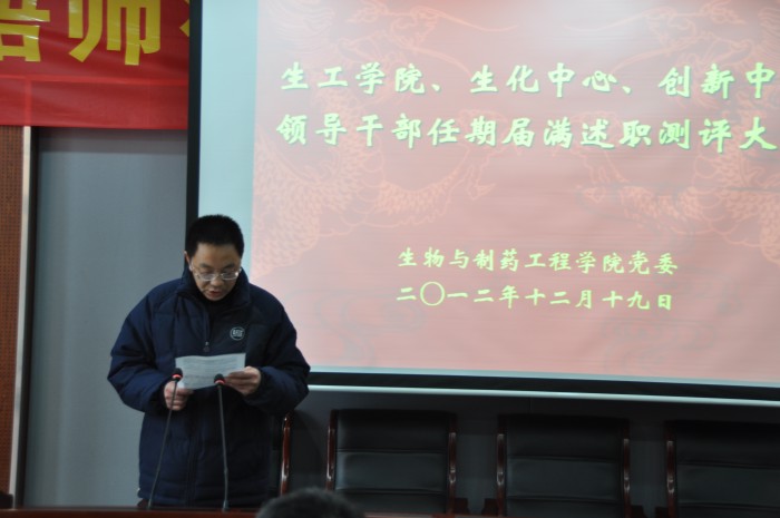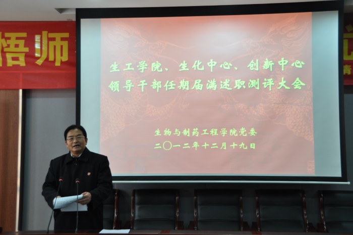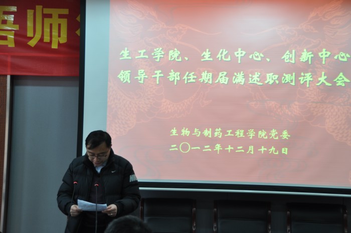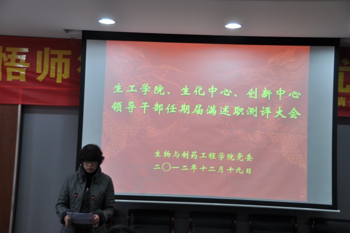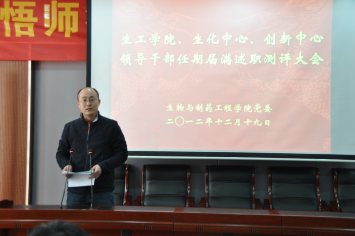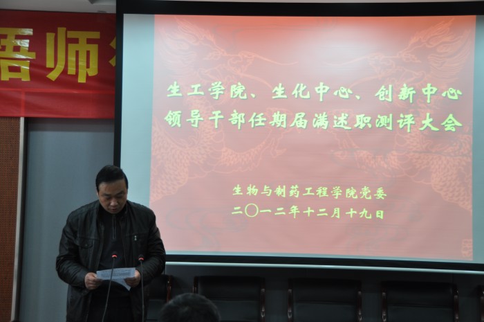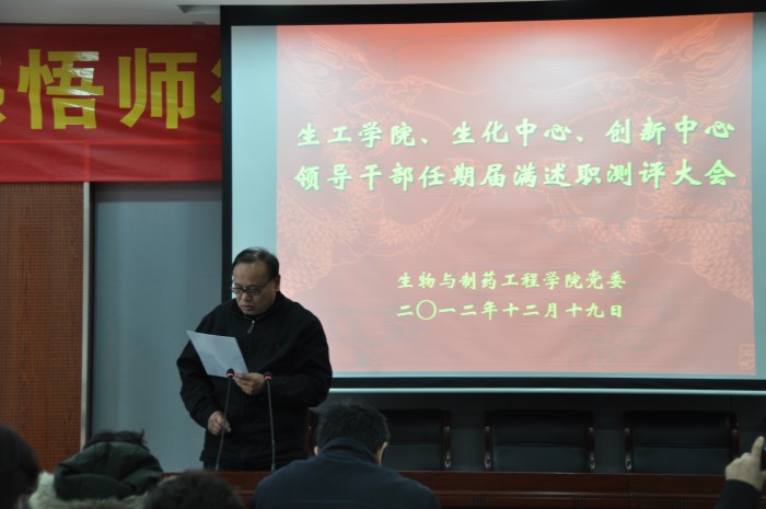 根据公司党委“关于中层干部任期届满考核工作的通知”精神,公司党委于2012年12月19日下午在生工学科楼报告厅举行领导干部任期届满述职述廉测评大会。公司党委委员、工会主席、教工党支部书记、各系(室)负责人、副高以上教师、副科级以上干部,公司党代会、教代会代表,特邀监察员、民主党派人士参加大会,听取了太阳成集团tyc33455cc、国家生化中心和江苏省工业生物技术创新中心领导干部述职。