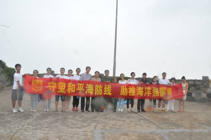 在王继才夫妇每天升旗的地方,小分队的师生与王继才夫妇在雨中共同展开“守望和平海防线,助推海洋强国梦”的横幅标语合影,留下了难忘的记忆和美好的憧憬!