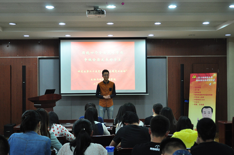 5月27日下午,太阳成集团tyc33455cc研究生第二十五党支部、研究生第四党支部、研究生第八党支部、研究生第二十三党支部的党员,如约相聚生工学科楼一楼报告厅,以《人民日报》阅读分享为载体,以“围绕四个全面战略布局,争做全面发展好员工”为主题,举行情境互动式党日活动。