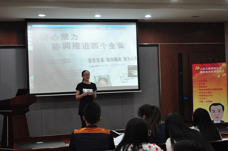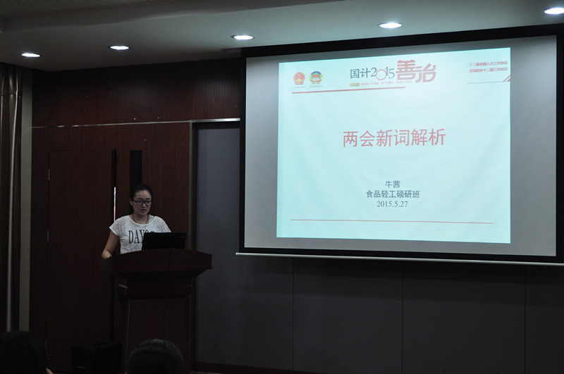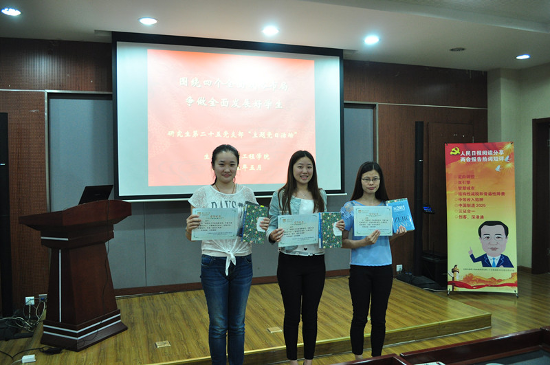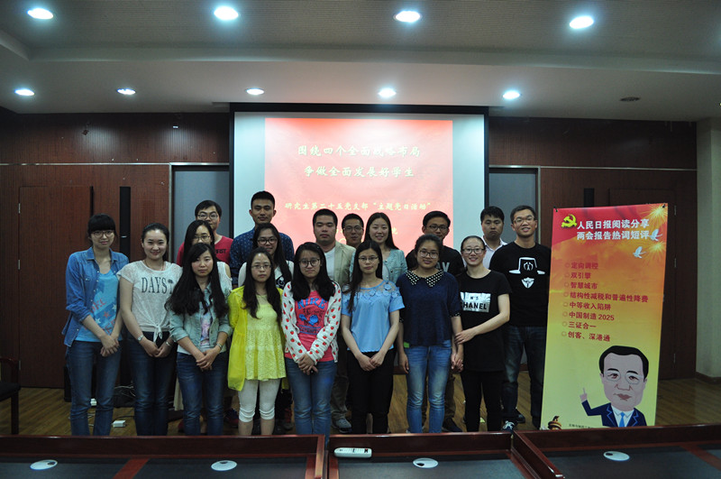 会上,研究生党员们聚焦党的十八大以来以习近平为总书记的党中央提出并形成的“四个全面”战略布局,以及今年全国两会政府工作报告中李克强总理提出的20个新词,思考“四个全面”战略布局与全国两会新词的科学内涵及其对研究生党员全面发展提出的新要求,联系实际交流心得体会。研究生第二十五党支部书记刘毅同学作了主旨演讲,深感“全面建成小康社会、全面深化改革、全面依法治国、全面从严治党”战略布局中的每一个“全面”都具有重大战略意义,也为党员研究生在培养创新精神、实践能力、改革意识、法治自觉、社会责任和党性修养等方面,开拓了全面发展的新境界。高天婴同学在《评“时和势都在我们这边”》的演讲中,阐述中国经济社会已经全面进入新常态,认为新常态会变成“稳定态”,带来“新状态”,正是可以振翅高飞之时。薄芳芳同学的演讲《让人民对改革有更多的获得感》,结合PPT展示,讲述了完善现代市场体系、推进社会事业创新的具体举措,从而能使人民切实地品尝到改革的果实。吴娟同学在演讲中针对今年的全国劳动模范和先进工作者名单做了一份统计分析,得出基层劳动人民的获奖比例逐年提升,反映了国家对基层劳动人民的关注更加密切。王小军等同学在演讲中对李克强总理提出的一些新词,比如“智慧城市”、“中国制造2025”、“创客”、“中等收入陷阱”等新词进行了解读和分析,展现了他们积极思考、探索求真的品质。活动中,与会党员踊跃发言,气氛热烈。最后,经过与会党员互评,于敏、薄芳芳、牛茜等三位同学在本次活动中获得“最佳表现奖”。