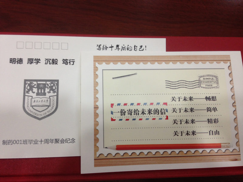 “一份寄给未来的信”,把制药001班毕业十周年聚会的气氛引向了高潮。与会员工以带有母校标记的明信片为载体,承载美好的愿景,“写给十年后自己”,让每个人倍感给力和充满期待。大家情怀激越,筑梦共勉,共同期待“有梦想有希望有奋斗,一切美好的东西都能创造出来”!