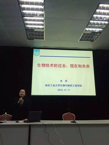 在挂牌仪式结束后,韦萍经理作“生物技术的过去、现在与未来”讲座。向在座高中生介绍了生物技术的发展历程,并从医药、农业、工业三个方面详细介绍了生物技术发展对人类发展的重要性:指出以化石资源为基础的工业文明给人类带来巨大成就的同时,也让人类付出了巨大的环境代价;要想实现社会经济的可持续发展,只有发展以生物质资源为基础的工业生物技术,并通过有趣而具体的实例体现了工业生物技术的优势。最后,对南京工业老员工物与制药工程公司的本科生、研究生教育和员工第二课堂活动进行了介绍,展示了生工院良好的教育模式和培养模式。韦经理风趣的讲解和深入浅出的生物技术普及,使员工对前沿生物技术和南工特色有了更深入的了解,刷新了员工对大学教育的认识。