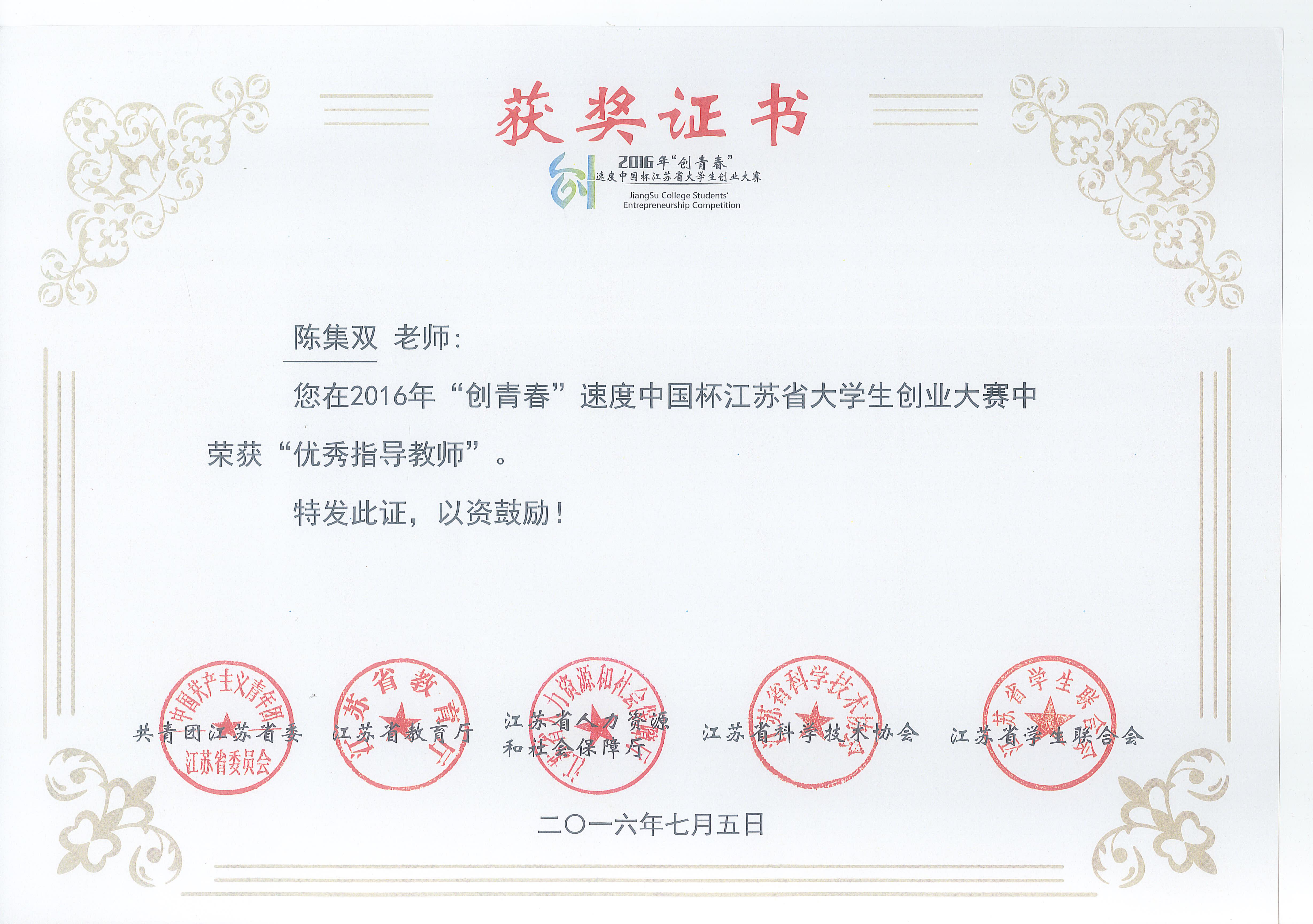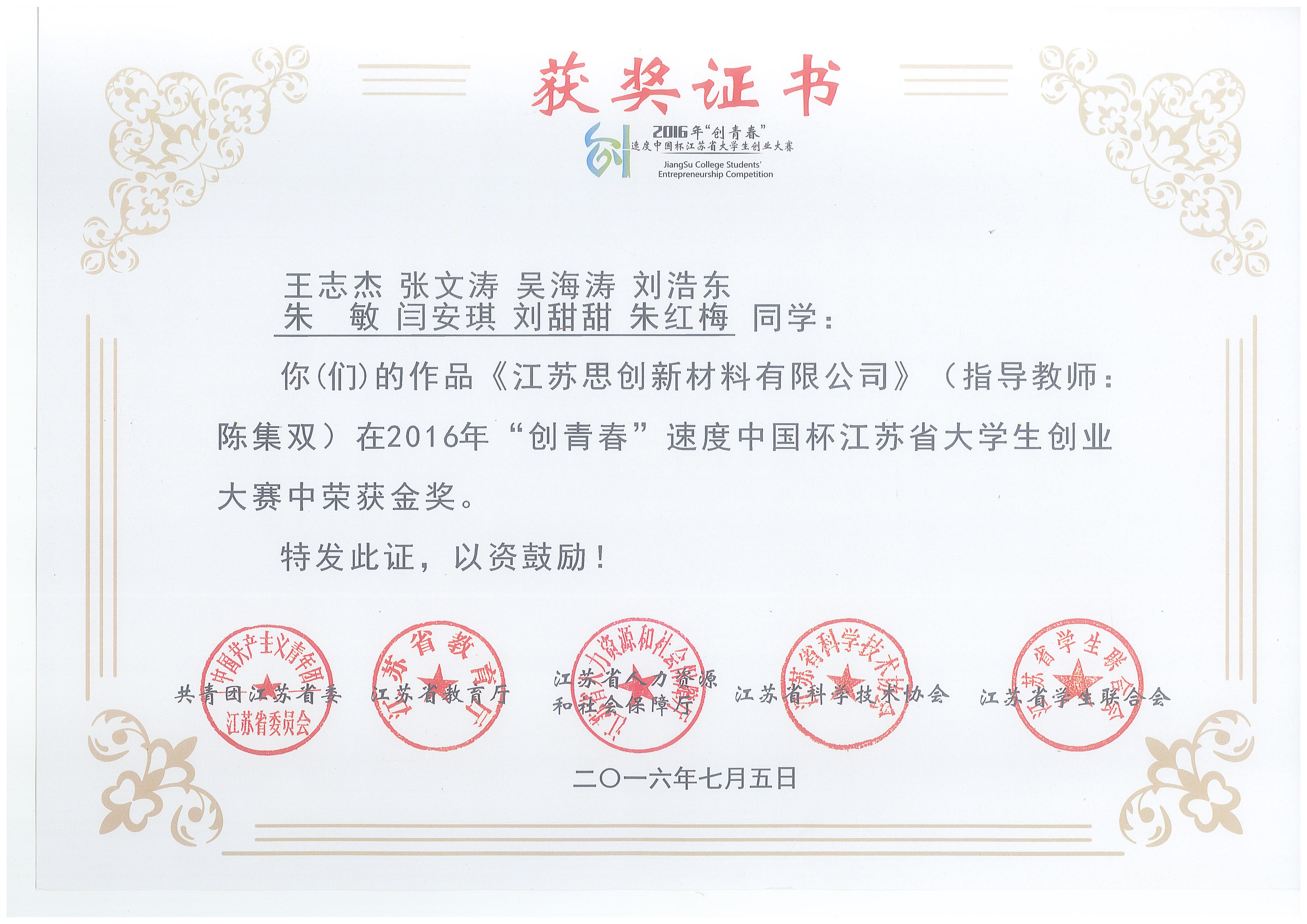 近日,2016年“创青春”江苏省老员工创业大赛比赛成绩公布确认,太阳成集团tyc33455cc选送的作品《南京维思创新材料科技有限公司》喜获大赛金奖;指导老师陈集双教授获“优秀指导教师”。