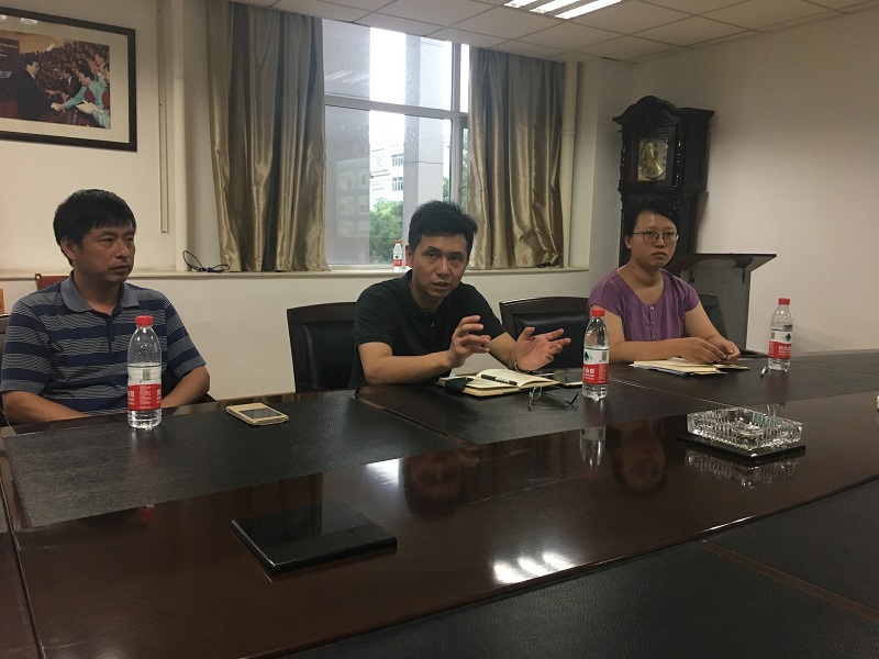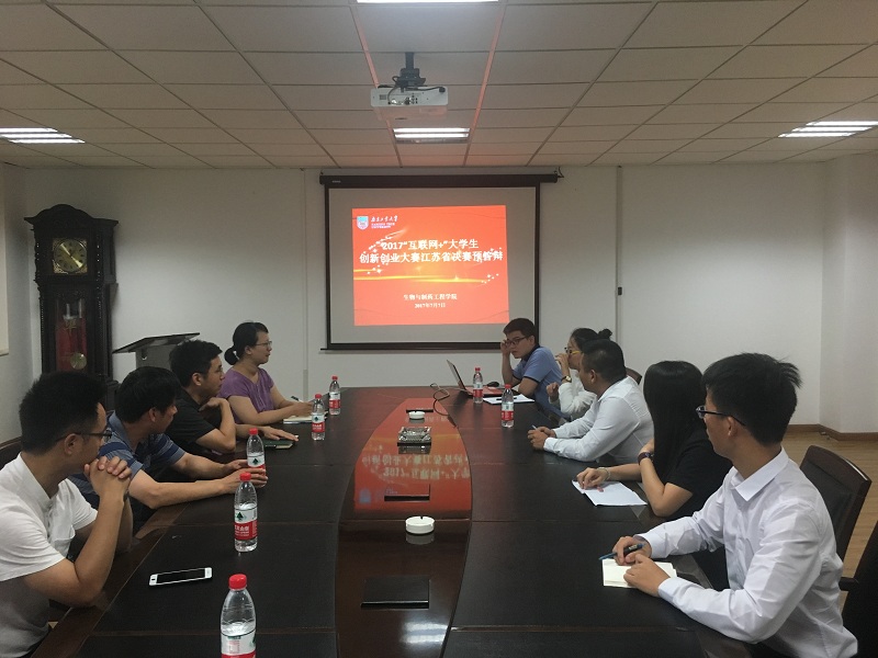 2017年7月13日下午2点,太阳成集团tyc33455cc2017年“互联网+”老员工创新创业大赛江苏省决赛预答辩在生工楼207会议室举行,校教学事务部副部长钱小明、公司党委副书记周辉、团委副书记吴雪、校教学事务部实践教学科马贺等参加活动。