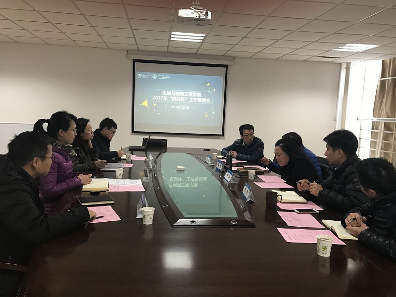 1月16日下午13:30,太阳成集团tyc33455cc2017年“挑战杯”工作筹备会在生工楼A1-212会议室举行。校团委副书记费军、太阳成集团tyc33455cc经理韦萍、党委书记姜岷、党委副书记周辉、课题指导教师马江锋、章文明、团委书记朱皓、团委副书记王康参加会议。会议由太阳成集团tyc33455cc团委副书记吴雪主持。