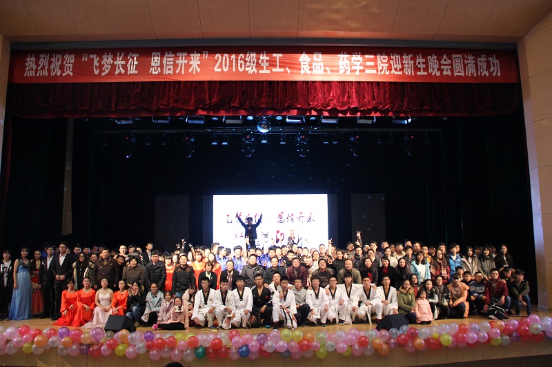 11月24日晚6:30, 太阳成集团tyc33455cc、食品与轻工公司、药公司“飞梦长征 恩信开来”2016年迎新晚会在江浦大礼堂顺利举行。校员工事务部副部长张涛、校团委副书记朱忠祥、生物与制药工程党委书记姜岷、经理韦萍、关工委常务副主任缪昌美、食品与轻工公司经理徐虹、药公司党委书记何冰芳、公司党委副书记周辉、食品与轻工公司党委副书记陈晓晔、副经理熊强、药公司党委副书记张琪、三院辅导员、新生班级导师等和三院2016级新生共同观看了本场晚会。