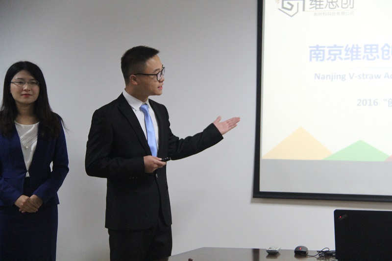 在展示环节,“南京维思创新材料科技有限公司”团队成员结合PPT演示介绍了公司的创业规划,并详细阐述了公司以及秸塑新材料应用的市场发展前景。在答辩环节,团队成员就公司的创业计划回答了现场评委的提问,评委老师对团队的PPT展示以及答辩表现提出了意见。