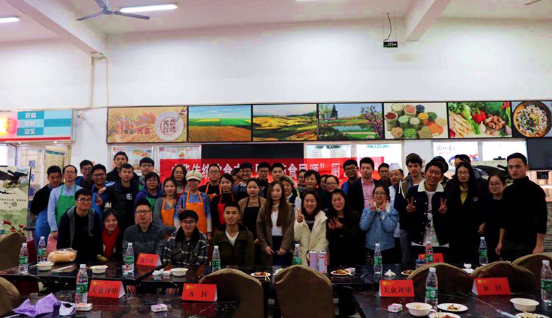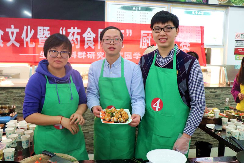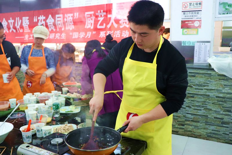 平日里同学用餐吃饭的餐厅,此时已经变了模样,前方一组组炉灶炊具,正对着一排排餐桌。六组研究生同学穿上围裙,准备好厨具,个个跃跃欲试。六组参赛选手分别是“中华三败家队”、“诗和远方队”、“吃货队”、“红鲤鱼与吕布鲤鱼与驴队”、“泡芙芒果班戟队”以及“三人行队 ”,他们来自不同的课题组,此时聚集在一起,准备在灶台上一战高下。首先进行的是知识问答环节,每组参赛队伍都积极抢答每一道题目。经过几轮的比拼,最终第四队拿到了最高的6分;第二队和第六队各拿4分,其余队伍也都有2分进账,他们相继的拿到了自己所需要的食材。真正开始展现厨艺高低的环节是第二个环节,选手们按顺序选取食材、各展身手。20分钟比赛时间内,主持人还为大众评审们准备了有奖问答环节,在座的同学们踊跃参加,积极举手。第二环节第一队为大家制作了两道菜品:芹菜炒肉和培根金针菇;第二队则端出一道肉末配煎豆腐的精美菜品;第三队一道地道的回锅肉;第四队的菜品最为精美,为香菇丸子,香菇做底,装满肉末,最后淋上酱汁,赢得了大家的一致好评;第五队的三鲜土豆以经典的口味同样也征服了评委们;第六组则以一道东北炖同样征服了大家的味蕾。大家的菜品不分伯仲,最终嘉宾和评审们给出了相应的分数,第四队毫无悬念的取得了最高分。最后一轮是固定菜式环节。第一队、第五队做出了一道美味的宫保鸡丁,第二队、第六队以精湛的刀工完成一道鱼香肉丝,第三队和第四队同时选择做干锅包菜,经过嘉宾们和大众评审们的品尝,选出了各自喜爱的菜品。经过三轮的比拼,最终第一队,第二队,第五队获得了三等奖;第四队、第六队获得了二等奖;第四队夺得一等奖。最后,浦园主厨为大家烹饪了一道华丽且美味的锦绣虾,获得大家一致的好评,中华传统饮食文化暨“药食同源”厨艺大赛也在欢声笑语中落下帷幕。