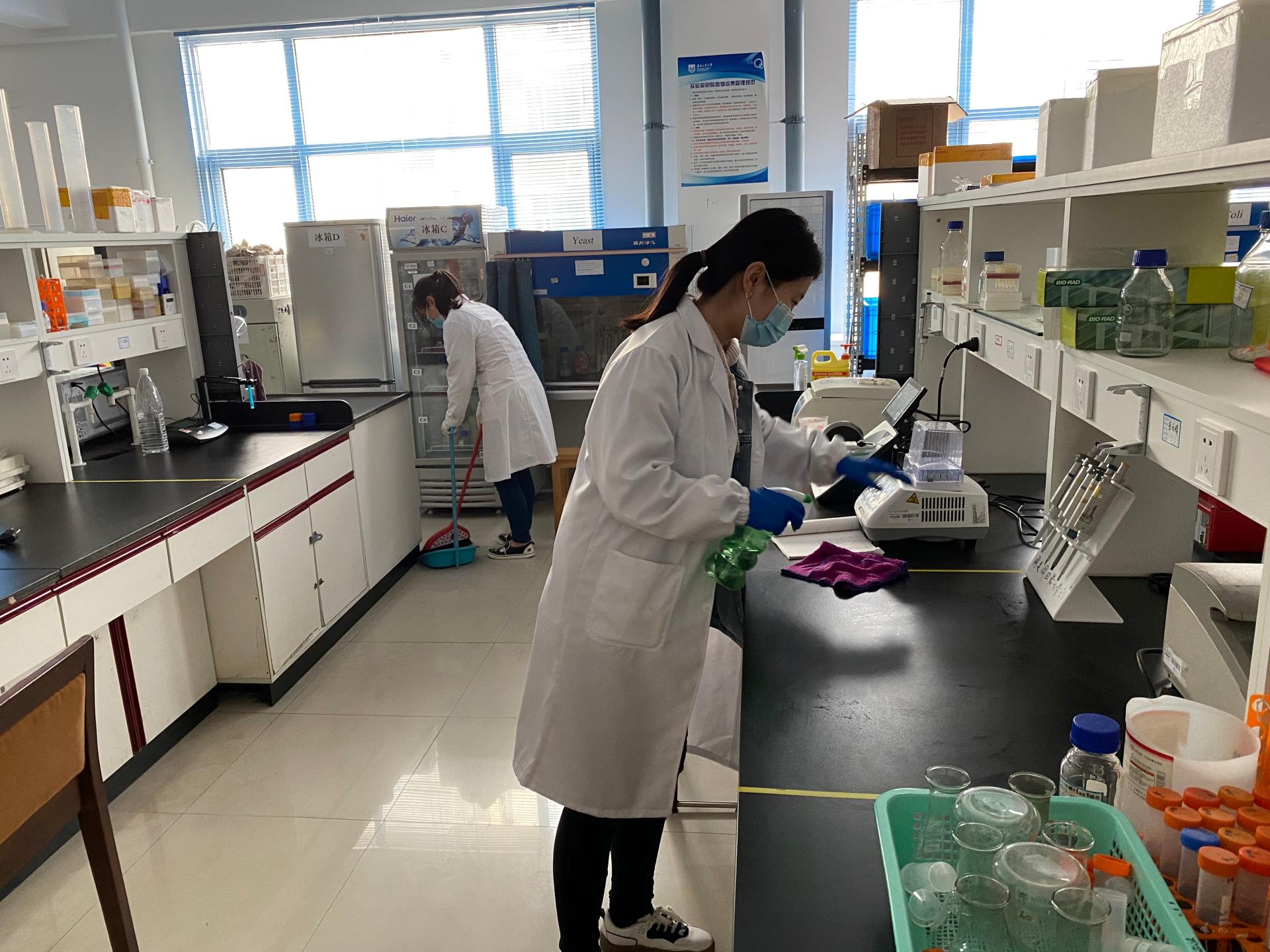 员工进入实验室后,随即打开门窗通风,认真打扫卫生,并仔细检查了水、电和设备运行情况。毕业班研究生党员还自发组成志愿者队伍到每个实验室发放消毒防疫物资。