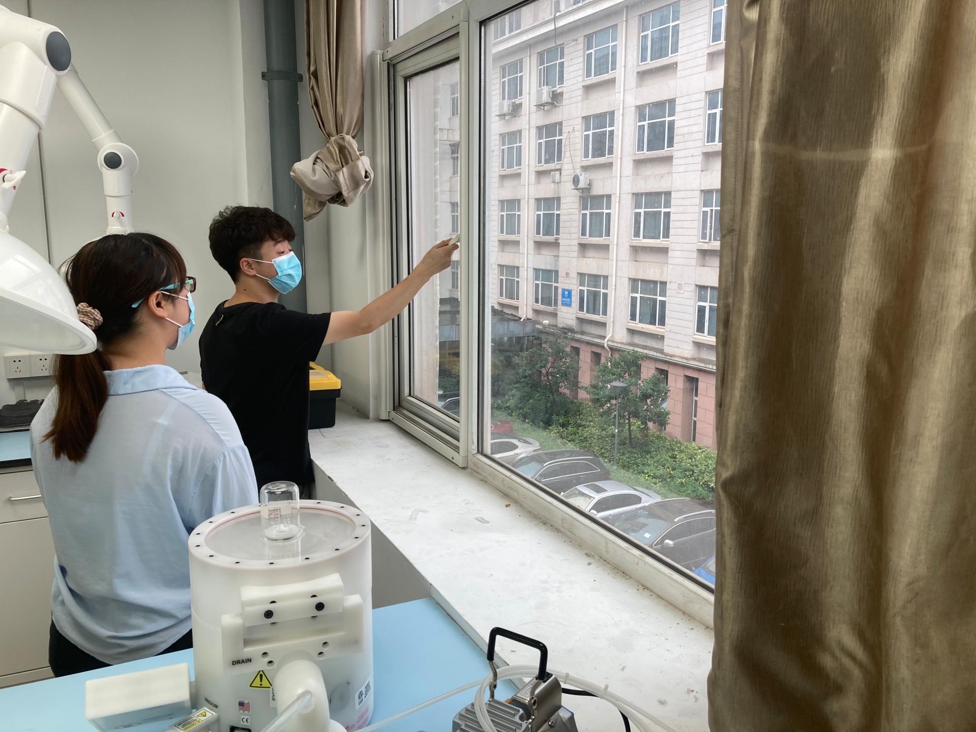 暑期留校参加科研实验的研究生党员们深入各实验室开展安全检查,详细检查了窗户是否关紧、气瓶等是否固定、顶楼是否有漏水等情况。研究生党员还详细了解了各实验室疫情期间药品储存柜、通风橱的使用情况和危化品废渣废液的暂存情况。