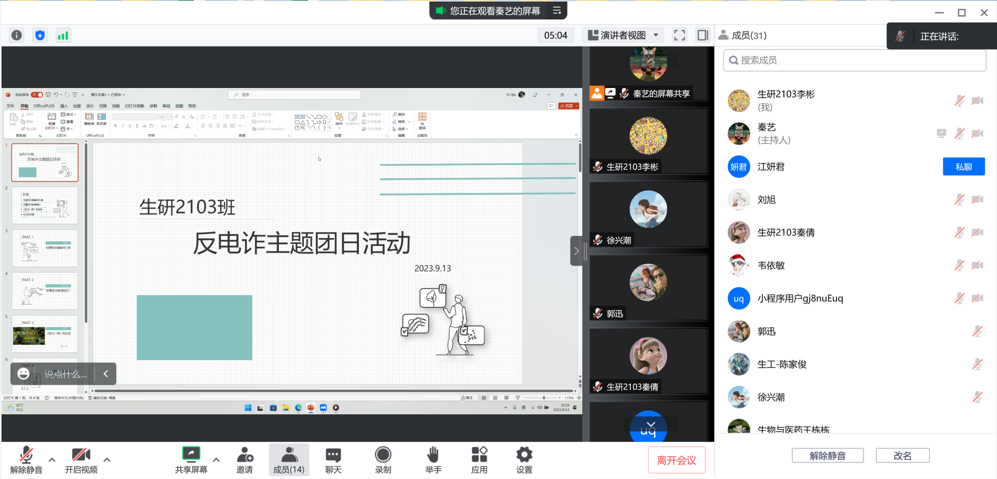 9月14日,公司邀请校保卫处在笃学楼为全体2023级本科新生开展校园安全教育。报告会后,全体新生班级就近召开反电诈专题班会。助理班主任领学了相关材料,全体同学观看了专题教育短片,并就如何提高意识,掌握知识展开了交流讨论。班会上,全体新生集中安装“国家反诈中心”APP,开通“骚扰电话拦截服务”功能,抄写反诈承诺书,参加线上反诈考试。在其他老生班级,各班长都按照通知精神部署开展了反电诈学习,辅导员结合员工实际从杜绝侥幸心理、养成健康爱好、树立反诈意识、加强阅读习惯养成和学风建设等方面进行引导教育。班会还进行了新学年班委选举,明确了生活委员兼任安全委员,全体班级委员积极响应老员工安全教育工作的新要求。