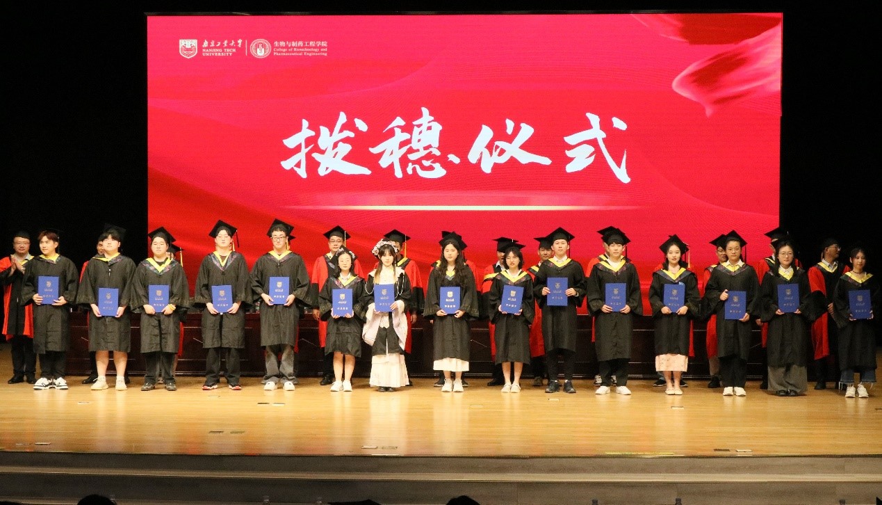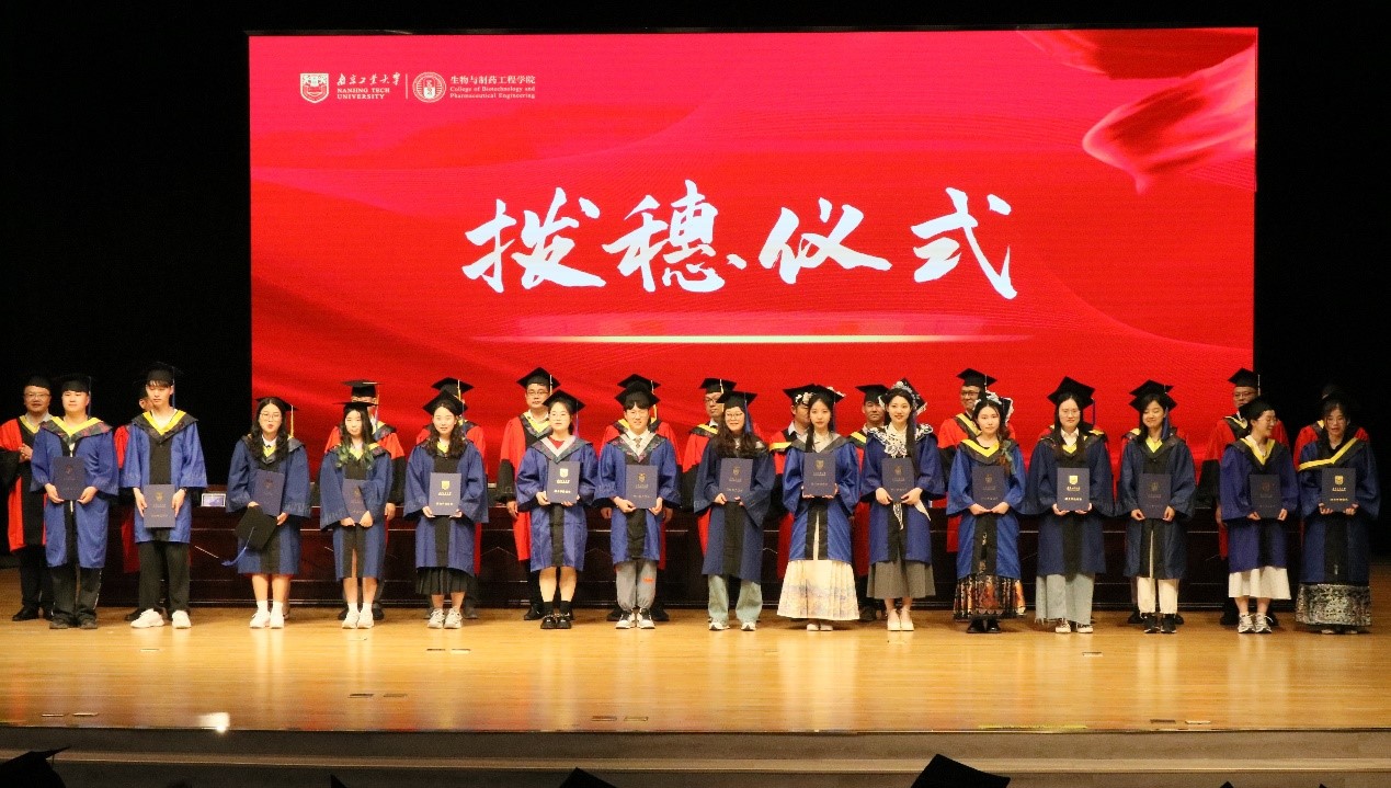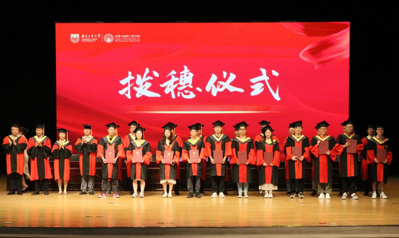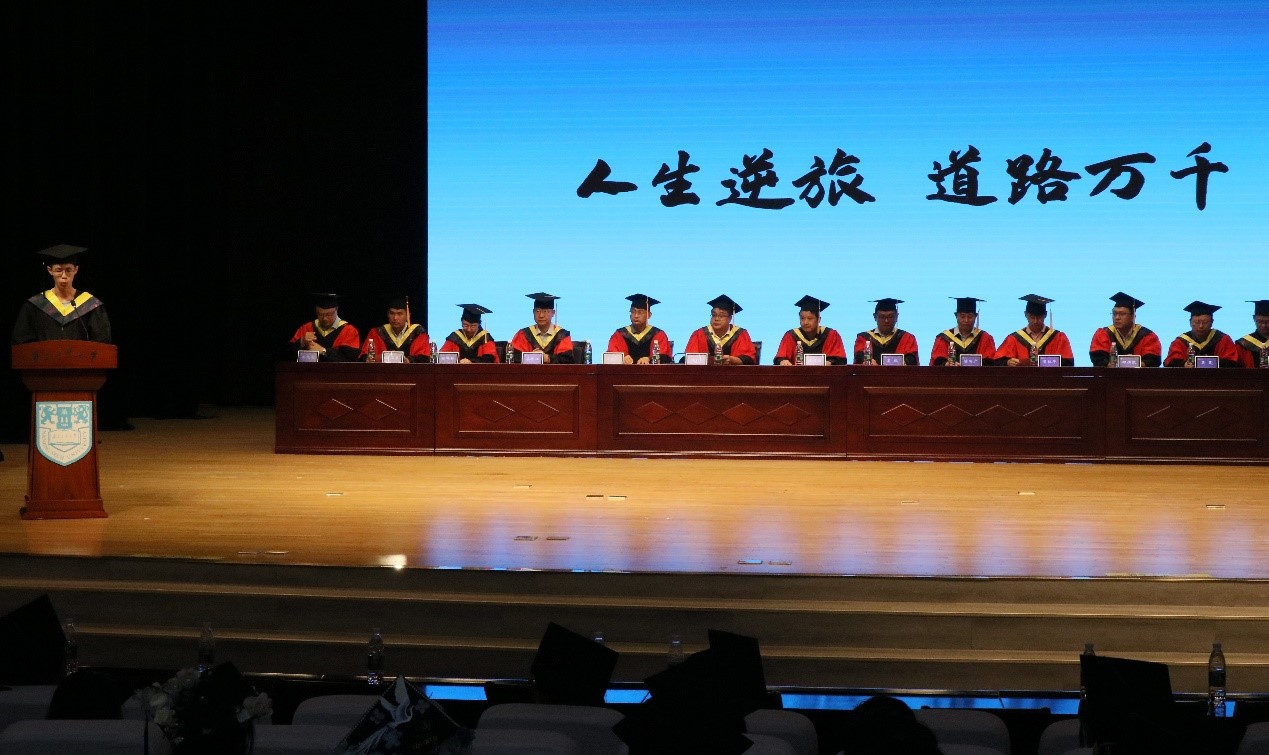 在动人的骊歌旋律中,主席台领导和导师为全体毕业生们一一拨穗正冠,合影留念。