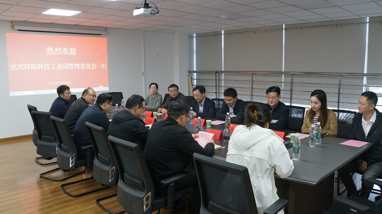 高振书记对来宾一行表示热烈欢迎,详细介绍了公司在生物制造、生物医药和生物环保等方面的科研和人才培养成果。他表示,公司与宜兴有着深厚的合作基础,希望双方聚焦产业一线,形成创新合力,共同服务江苏新质生产力发展需求。黄力副主任详细介绍了宜兴环保科技工业园。该园区是我国唯一以发展环保产业为特色的国家级高新技术产业开发区,形成了环保、电子信息、新材料、生物医药等四大高新技术产业集群。校团委书记王郁超就员工社会实践、博士团进企业等与园区领导深入交换意见。