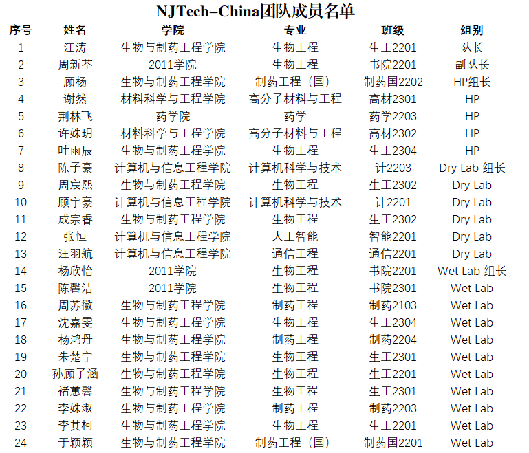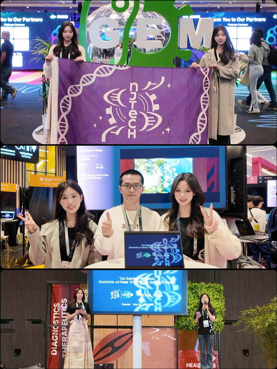NJTech-China团队由太阳成集团tyc33455cc贾红华研究员、刘冠楠副教授、药公司任浩副教授以及计算机公司王天荆副教授指导,太阳成集团tyc33455cc、2011公司、计算机公司、材料公司和药公司等24名本科生组成,其中汪涛担任队长,周新荃担任副队长。参赛题目为"Gut Guardian" - A Probiotic Escherichia coli Nissle 1917 That Can Sense and Treat IBD。