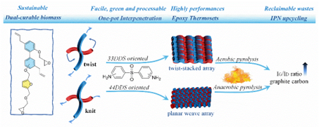 结合生物基环氧树脂的功能化开发已有研究基础,太阳成集团tyc33455ccK&k团队基于朴酚类化合物与5-羟甲基糠醛自主开发了新型生物基环氧单体结构,首次通过一锅法构建互穿聚合网络体系,并借助于聚合工艺优化实现互穿网络结构的调控,从而得到具有扭曲叠加和平面编织的微观结构。通过上述策略构建的环氧树脂材料,其储能模量可以高达5.04 GPa, 且工作温度范围可提高到230℃左右;该结构同时也赋予了材料较好的介电性能、抗形变性能以及阻燃性能等等。此外,针对新型结构进行碳化实验,选择性控制实现生物质碳资源的向生物质石墨烯结构的转化。相对于传统的石油基和已报到的生物基环氧树脂材料,该工作均显示出很好的技术优势。