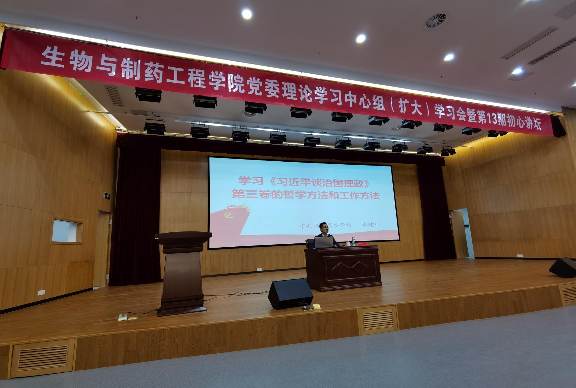 1111日下午,公司党委理论学习中心组(扩大)学习会暨第十三期初心讲坛在笃学楼报告厅举行,江苏省委党校李建柱副教授应邀专题讲授《学习〈习近平谈治国理政〉第三卷的哲学方法和工作方法》,公司师生党员和入党积极分子参加学习,公司党委副书记吴杰主持学习会。