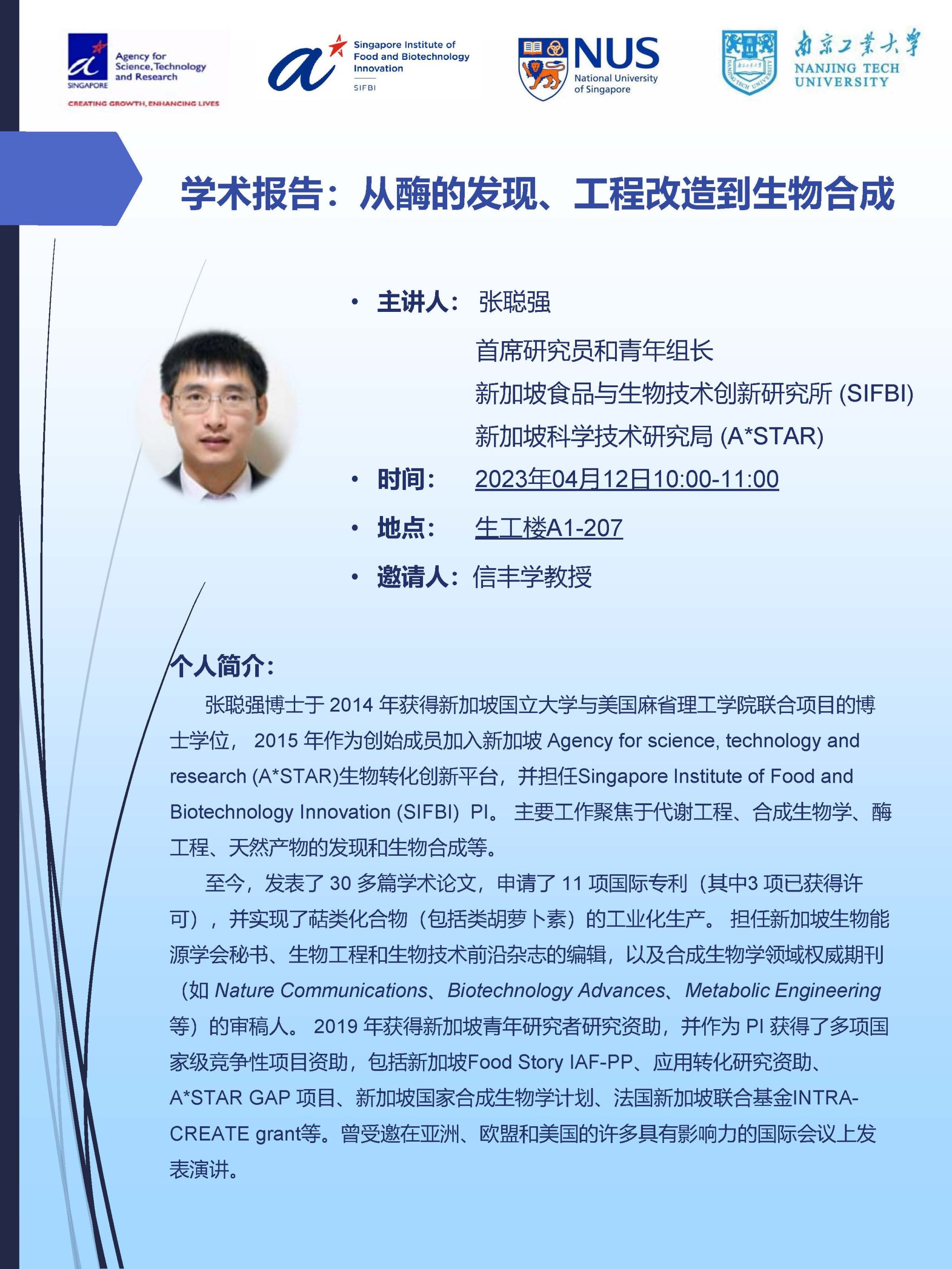 张聪强博士于2014年获得新加坡国立大学与麻省理工公司联合项目的博士学位。2015年作为创始成员加入 A*STAR 生物转化创新平台。现在是 SIFBI 的 PI,领导一个团队从事多个学术和工业界项目。主要工作聚焦于代谢工程、合成生物学、酶工程、天然产物的发现和生物合成等。