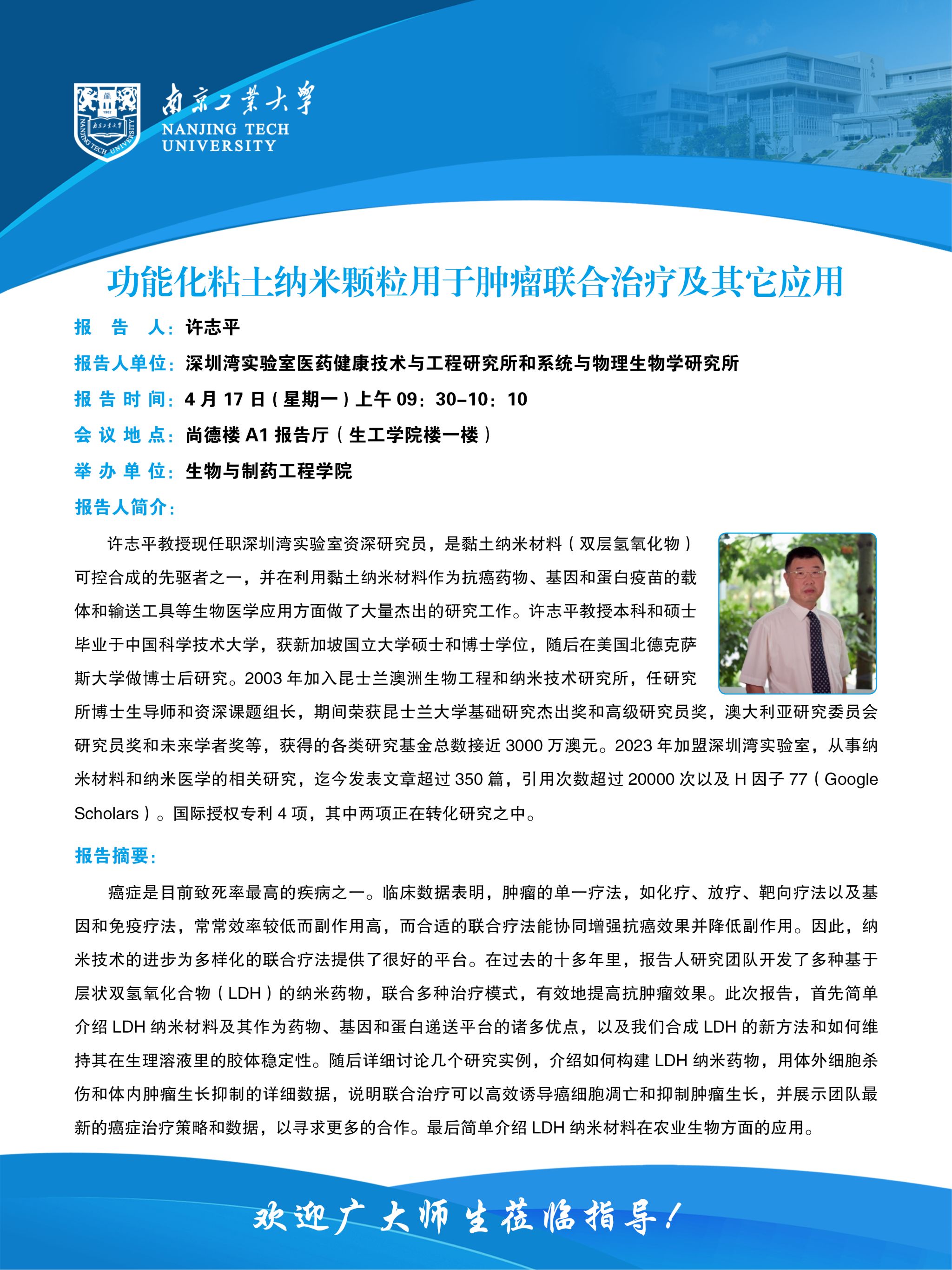 许志平:功能化粘土纳米颗粒用于肿瘤联合治疗及其它应用